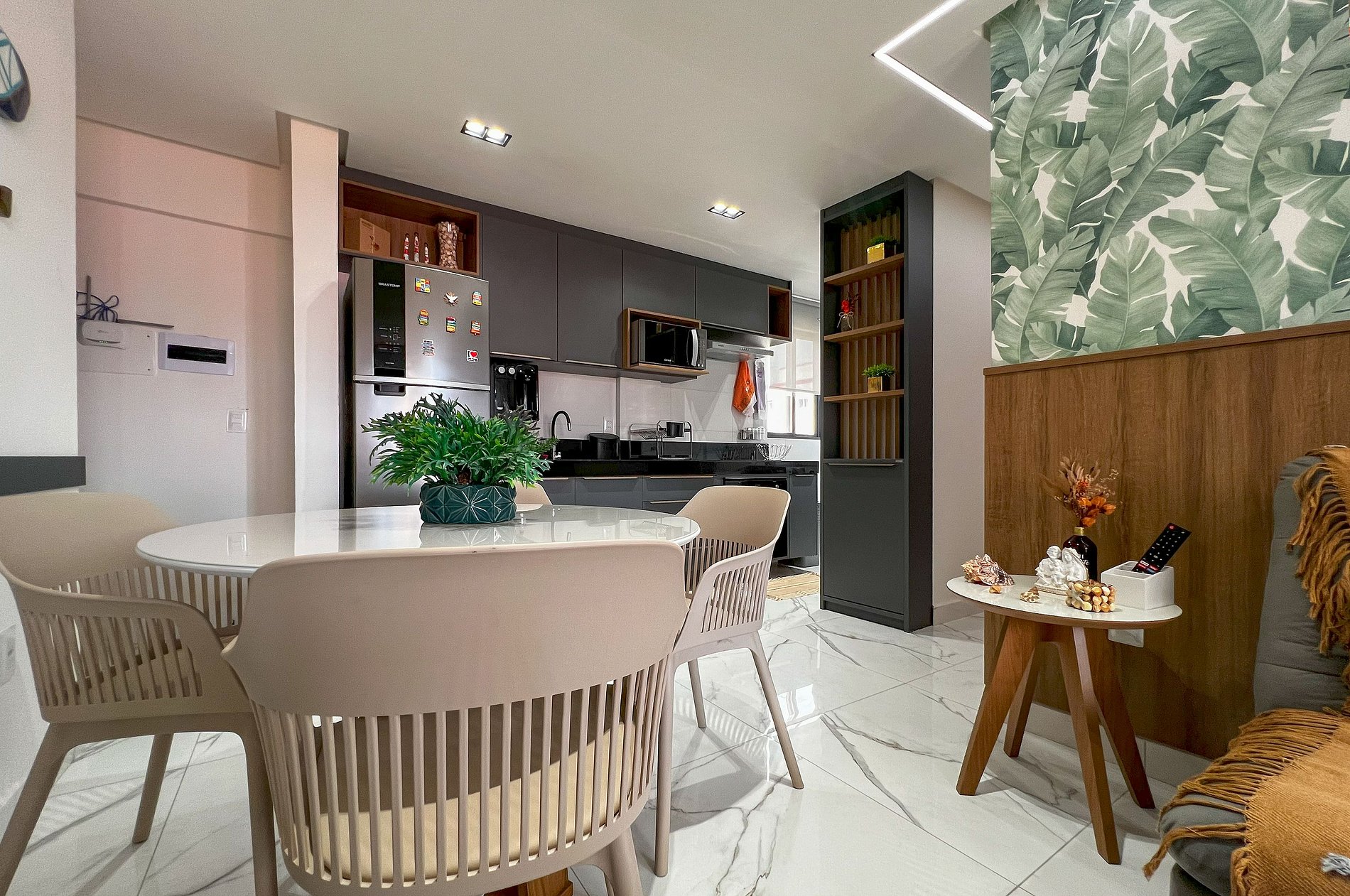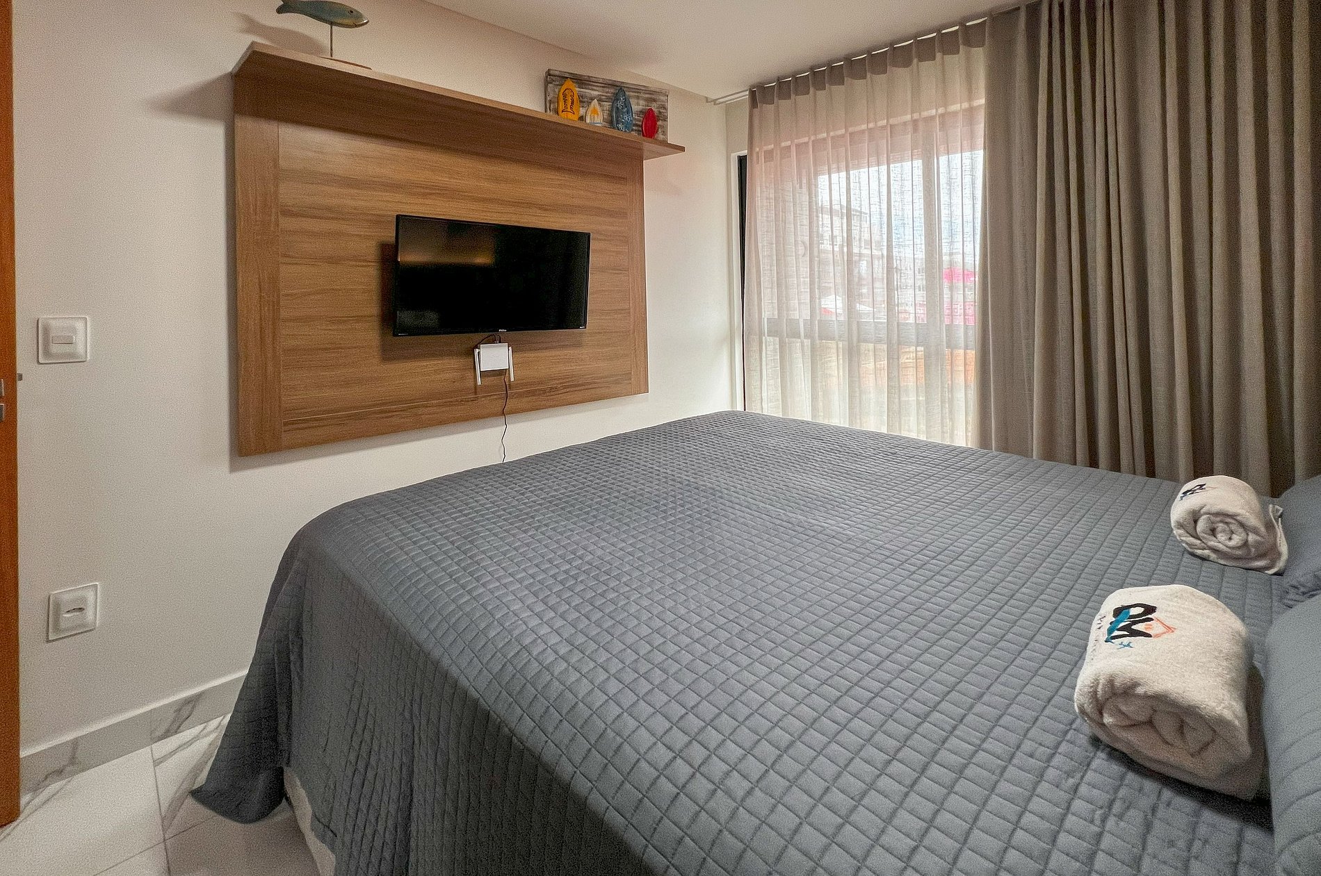 Charmoso apartamento na Praia do Bessa, o VILA ACONCHEGO RESIDENCE é um condomínio Familiar NOVO com apenas 9 unidades (entregue em Set/23), localizado apenas 200m do praia, pertinho de tudo que você precisa para maior comodidade (restaurantes, farmácias, padaria, posto combustível...), decoração moderna, cozinha super bem equipada, máquina lava e seca, 2 quartos, sendo 1 suíte master, ambos com ar condicionado, um local perfeito para descansar após um dia de praia. Na sala temos um confortável sofá cama, ar condicionado e TV Smart. As cortinas são blackout em todas as janelas, WiFi de alta velocidade e oferecemos roupas de cama e banho. 1 vaga na garagem (cabe veículos pequenos/SUV médio).