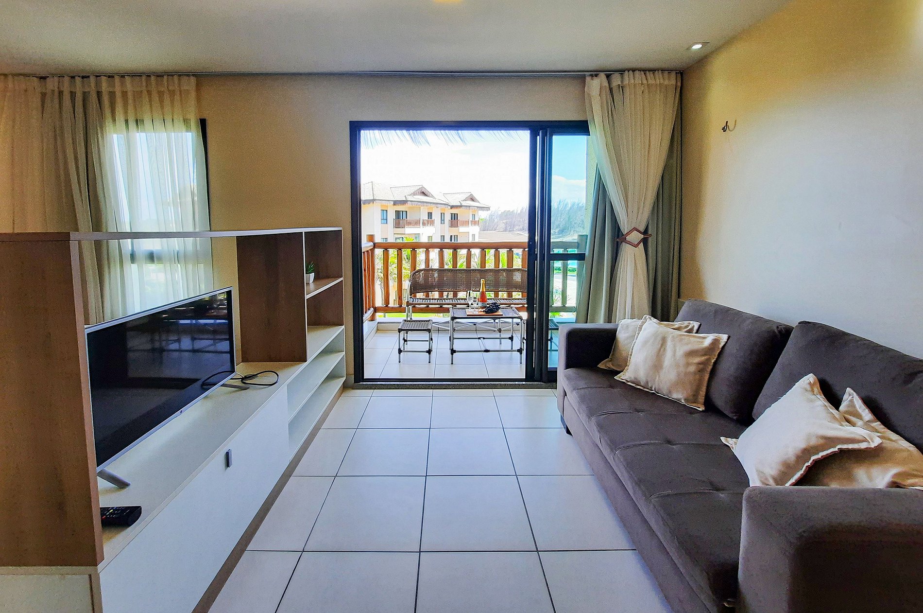 Apartamento de 39m² no VG Sun Cumbuco, localizado no 1º andar, posição sul, com 1 suíte com ar condicionado, e sala com sofá cama e TV, acomoda até 4 pessoas. Oferecemos enxoval de cama e banho completo, WiFi, 1 vaga para veículo disponível. O acesso ao apartamento se dá por fechadura eletrônica, para maior comodidade e segurança do hóspede. O condomínio possui portaria 24h.
