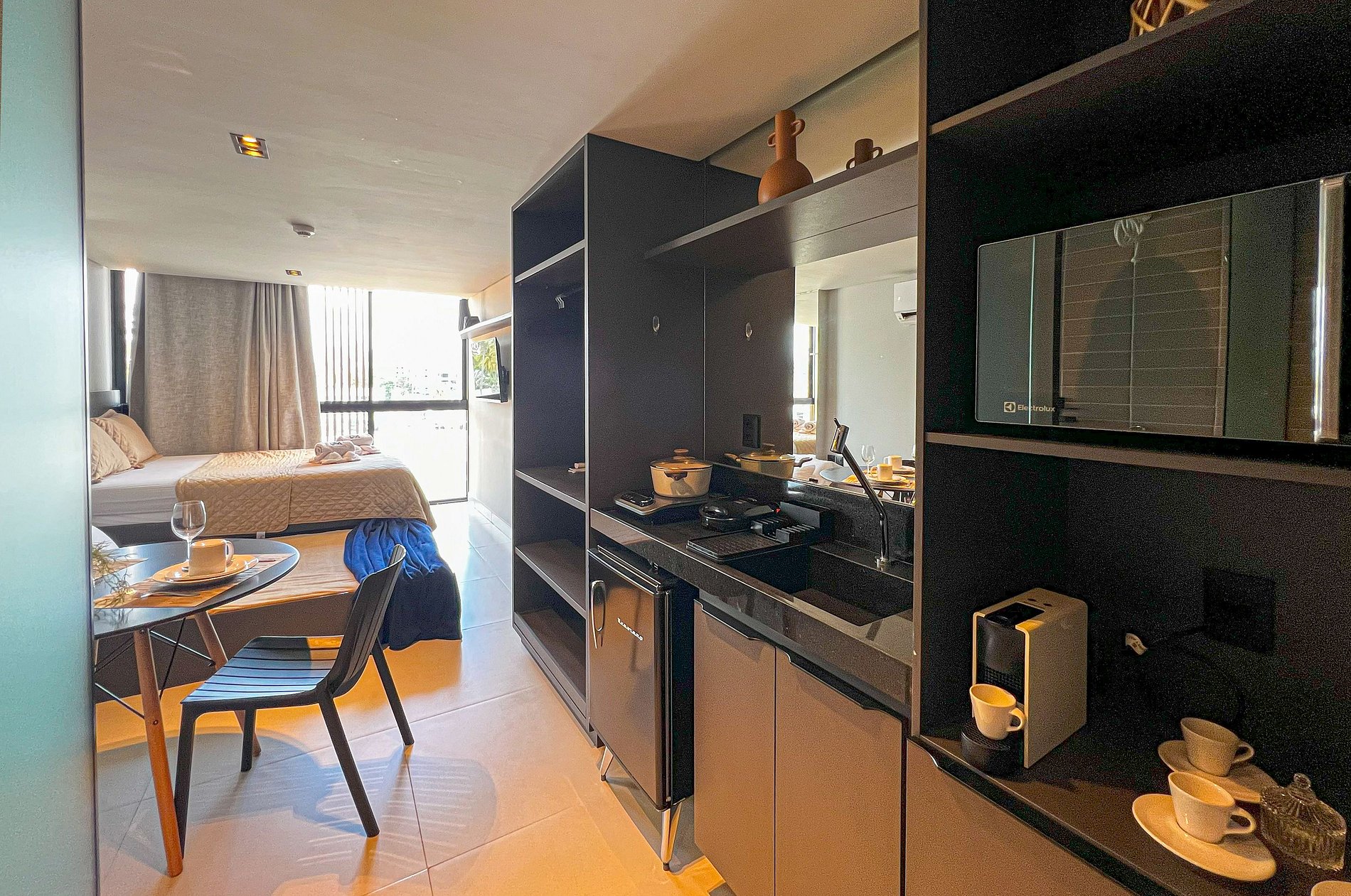O flat é equipado e moderno, perfeito para descansar após um dia de praia ou no rooftop do complexo. A suíte possui ar condicionado, armários, TV e acomoda até 4 pessoas (2 camas de casal). A cozinha é equipada com um frigobar, microondas, cooktop 1 boca, sanduicheira e utensílios básicos como talheres, copos e taças.