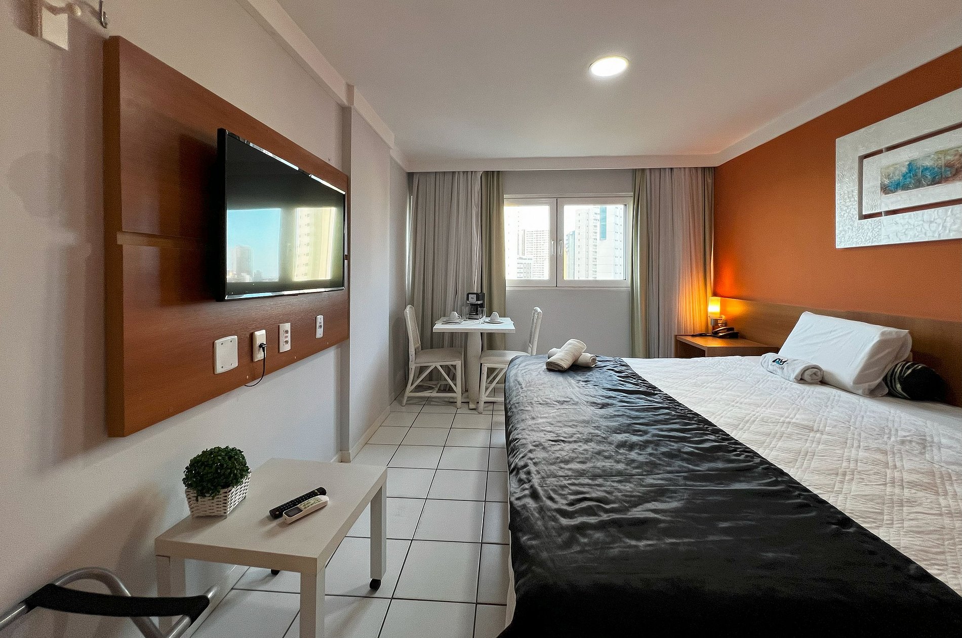 O flat reformado em 2024, com linda vista mar, possui 1 cama KING (gigante) e 1 cama de solteiro, podendo acomodar até 3 pessoas, e conta com uma vista lateral da praia e parte da cidade. O ambiente é refrigerado, tem WiFi e tem uma cozinha compacta com micro-ondas, frigobar, sanduicheira, liquidificador e máquina de café, perfeito para pequenas refeições.