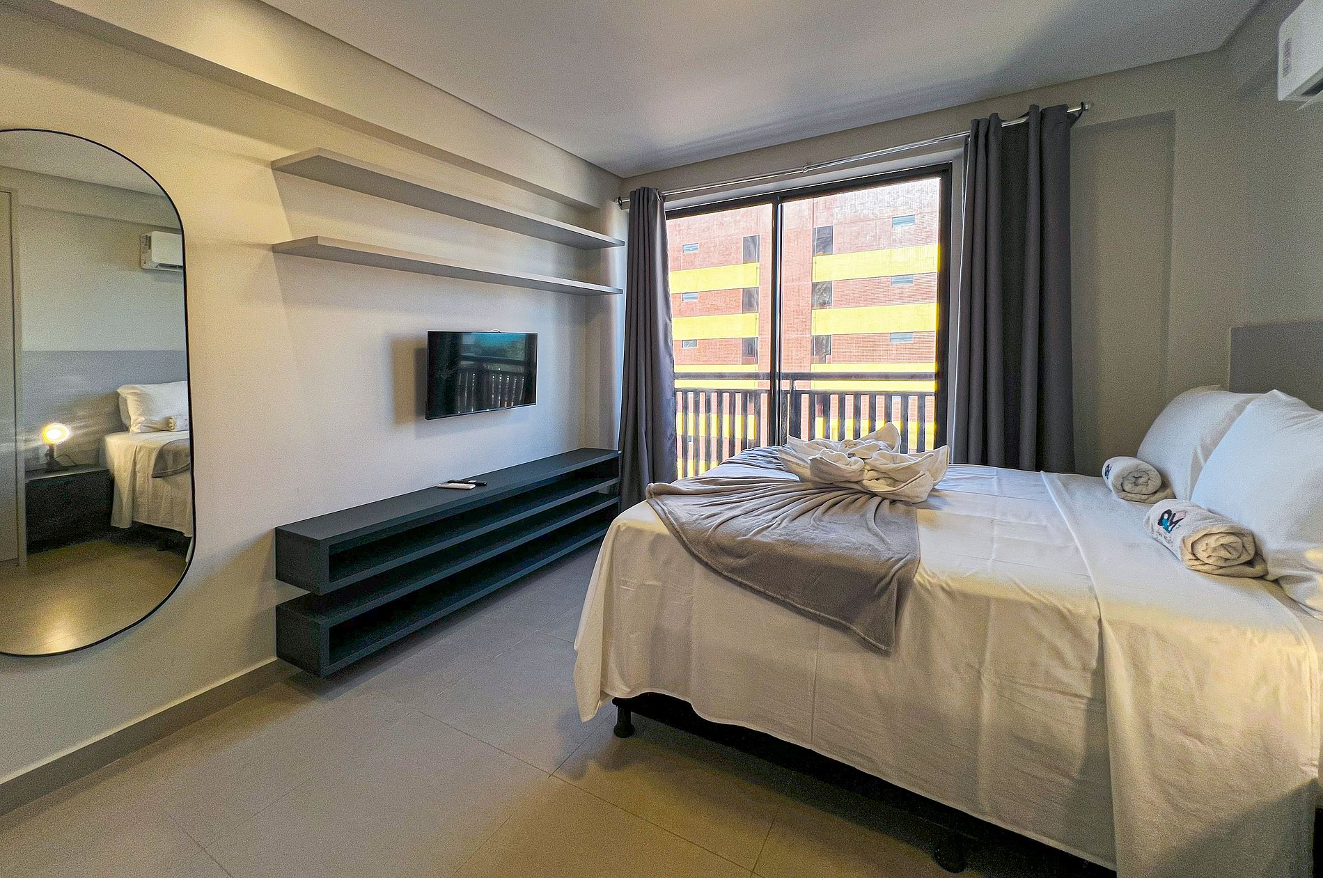 Flat em ambiente único com ar condicionado, acomoda até 2 pessoas (1 Cama de Casal), com TV, banheiro equipado, WiFi de qualidade, TV Smart, cozinha compacta bem equipada de utensílios, geladeira, fogão cooktop 2 bocas, cafeteira e micro-ondas. O prédio tem vagas de garagem rotativa (não garantimos disponibilidade). Apenas cerca de 100m da praia. Disponibilizamos roupa de cama e banho. O apartamento ideal para quem busca comodidade em um local novo, próximo as principais atrações da região.