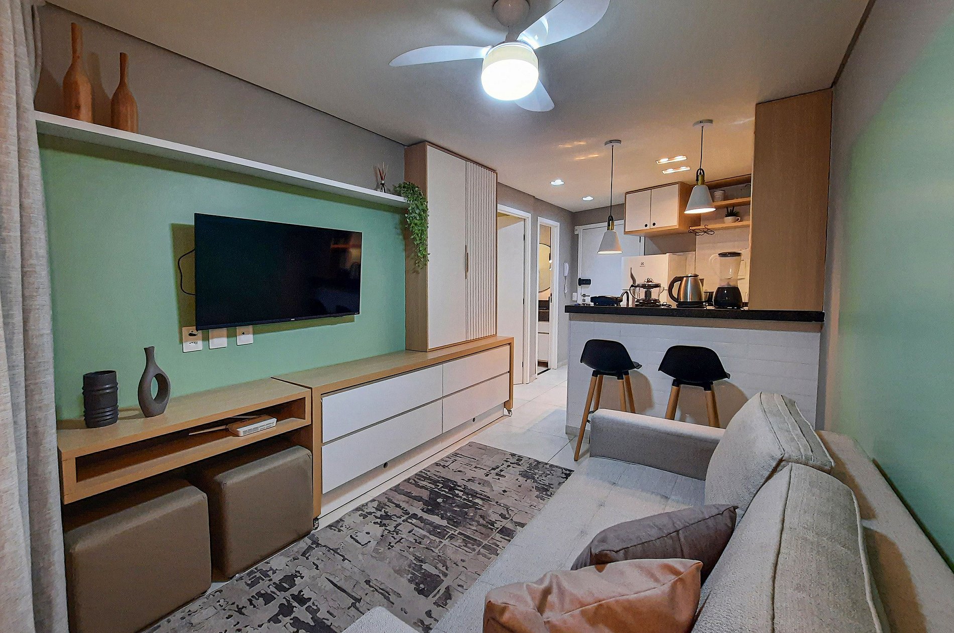 Nosso apartamento é super privilegiado, prédio novo (apto montado em 2024), super limpo e organizado. Localizado na área mais nobre de Fortaleza, pertinho de tudo que você precisa, a apenas 500m do mar (Aterro da Praia de Iracema). O apartamento contém 1 suíte com ar condicionado, sala com sofá cama e TV, cozinha completa com geladeira, micro-ondas, fogão com forno, eletrinhos e demais utensílios de cozinha. Condomínio muito familiar, com elevador, portaria eletrônica 24h e garagem rotativa (não garantimos disponibilidade). Especial para quem busca lazer e descanso.