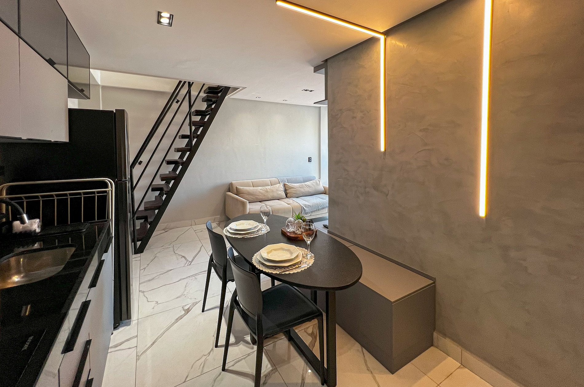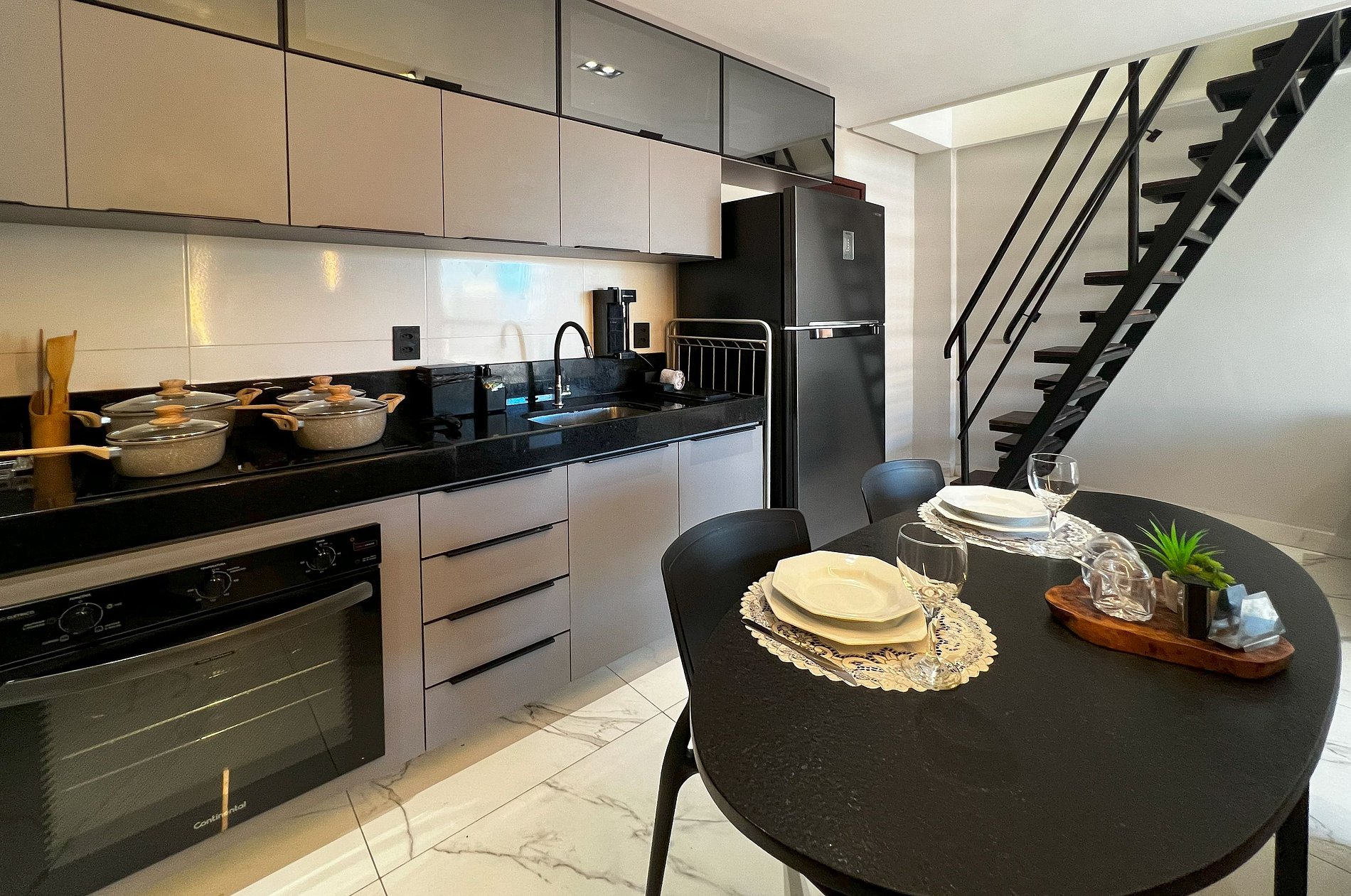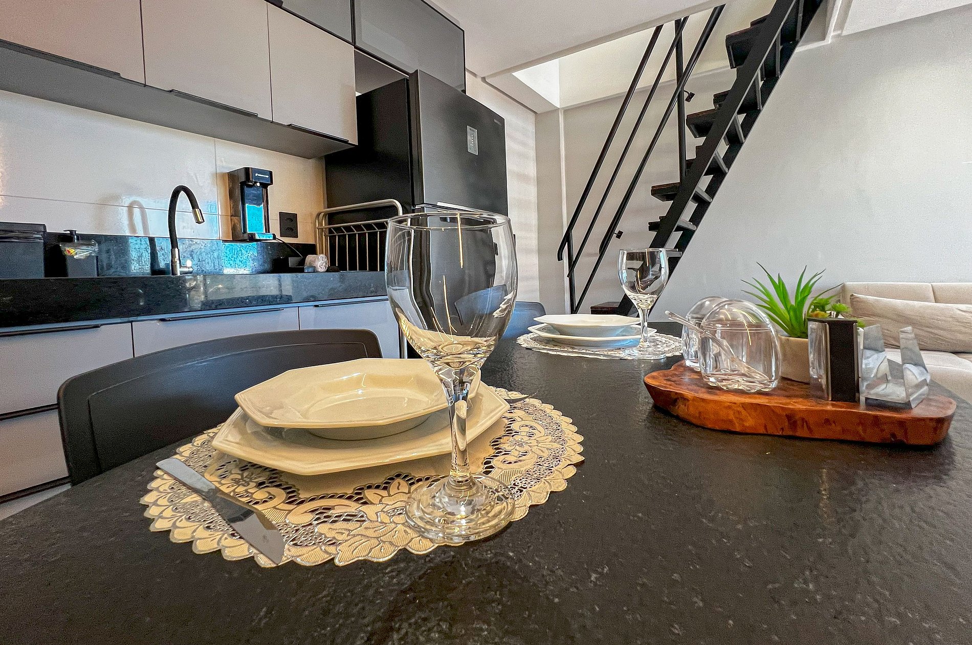 Charmoso apartamento duplex de 1 suíte, muito bem equipado, com TV Smart na sala, roupas, cozinha com cooktop, forno, air fryer, geladeira grande, filtro de água e Utensílios Domésticos para você se sentir em casa. 1 vaga na garagem (cabe veículo pequeno/SUV médio). O prédio fica pertinho de restaurantes, farmácias, padaria, posto de combustível, e etc.