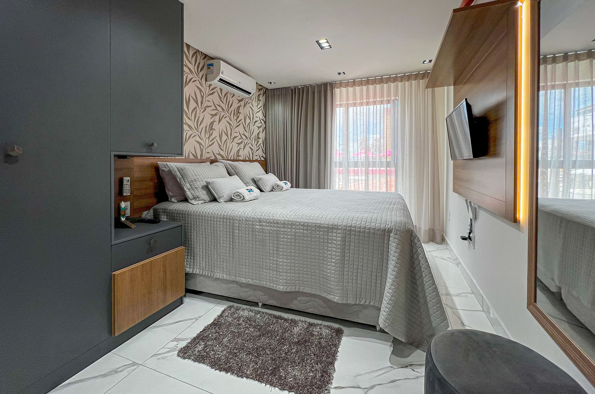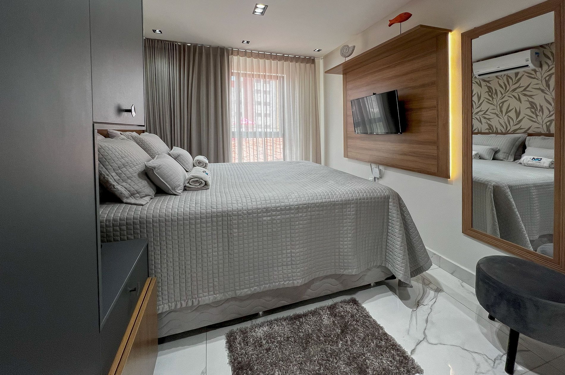 Charmoso apartamento na Praia do Bessa, o VILA ACONCHEGO RESIDENCE é um condomínio Familiar NOVO com apenas 9 unidades (entregue em Set/23), localizado apenas 200m do praia, pertinho de tudo que você precisa para maior comodidade (restaurantes, farmácias, padaria, posto combustível...), decoração moderna, cozinha super bem equipada, máquina lava e seca, 2 quartos, sendo 1 suíte master, ambos com ar condicionado, um local perfeito para descansar após um dia de praia. Na sala temos um confortável sofá cama, ar condicionado e TV Smart. As cortinas são blackout em todas as janelas, WiFi de alta velocidade e oferecemos roupas de cama e banho. 1 vaga na garagem (cabe veículos pequenos/SUV médio).