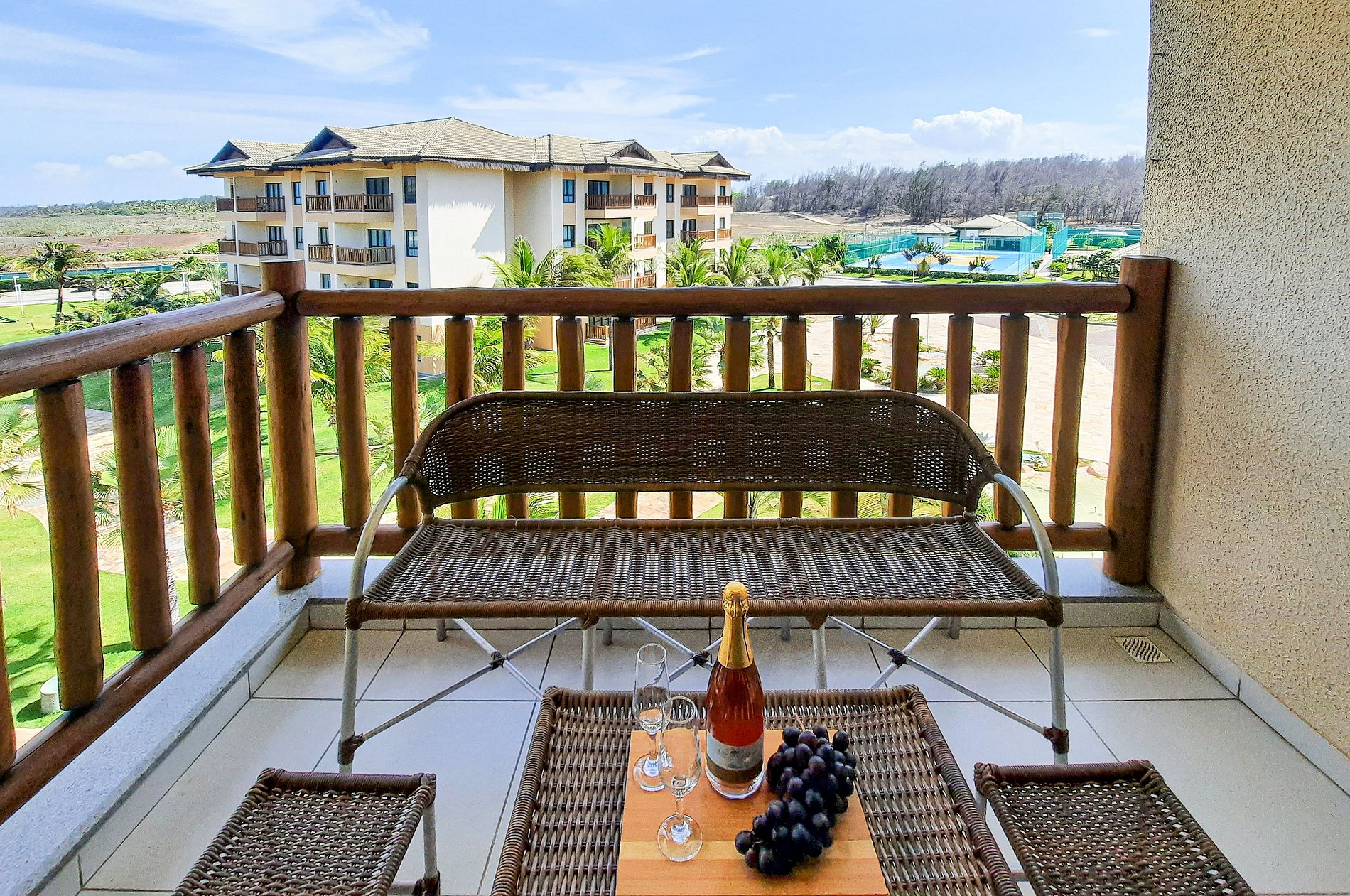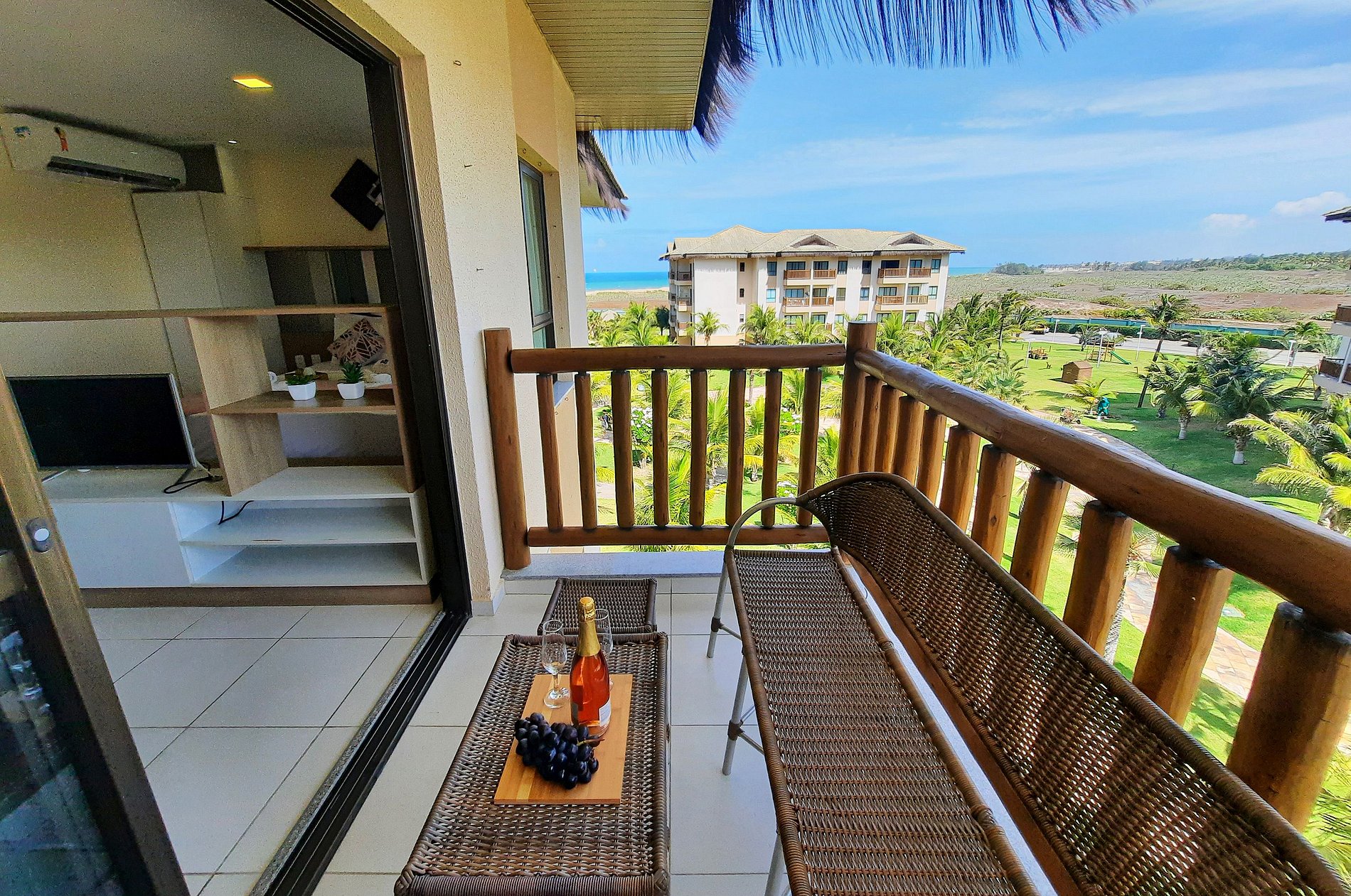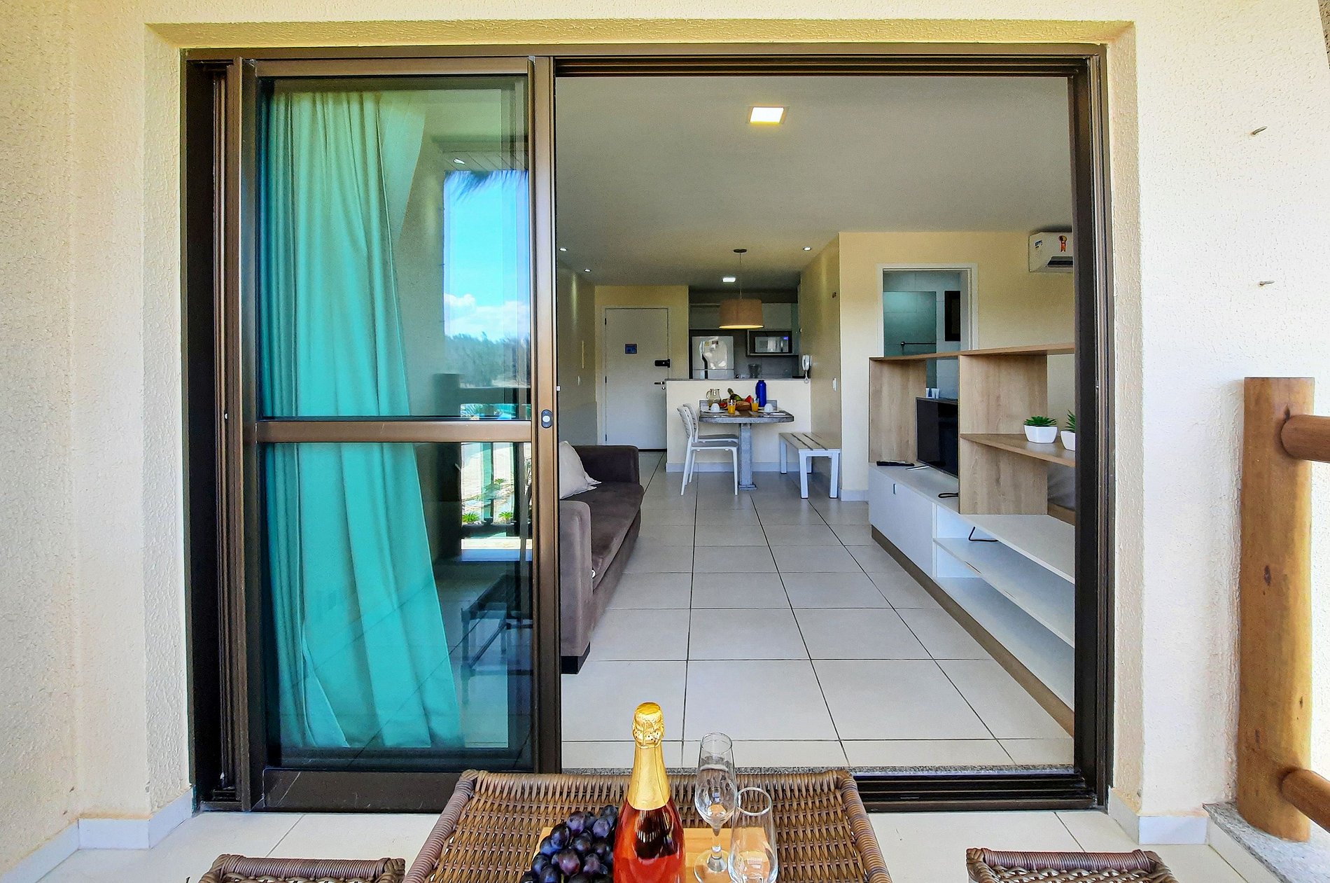 Apartamento de 39m² no VG Sun Cumbuco, localizado no 1º andar, posição sul, com 1 suíte com ar condicionado, e sala com sofá cama e TV, acomoda até 4 pessoas. Oferecemos enxoval de cama e banho completo, WiFi, 1 vaga para veículo disponível. O acesso ao apartamento se dá por fechadura eletrônica, para maior comodidade e segurança do hóspede. O condomínio possui portaria 24h.