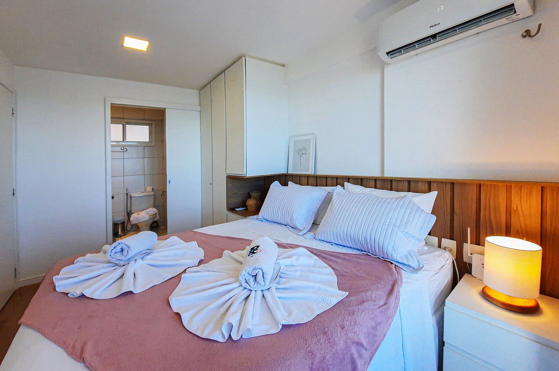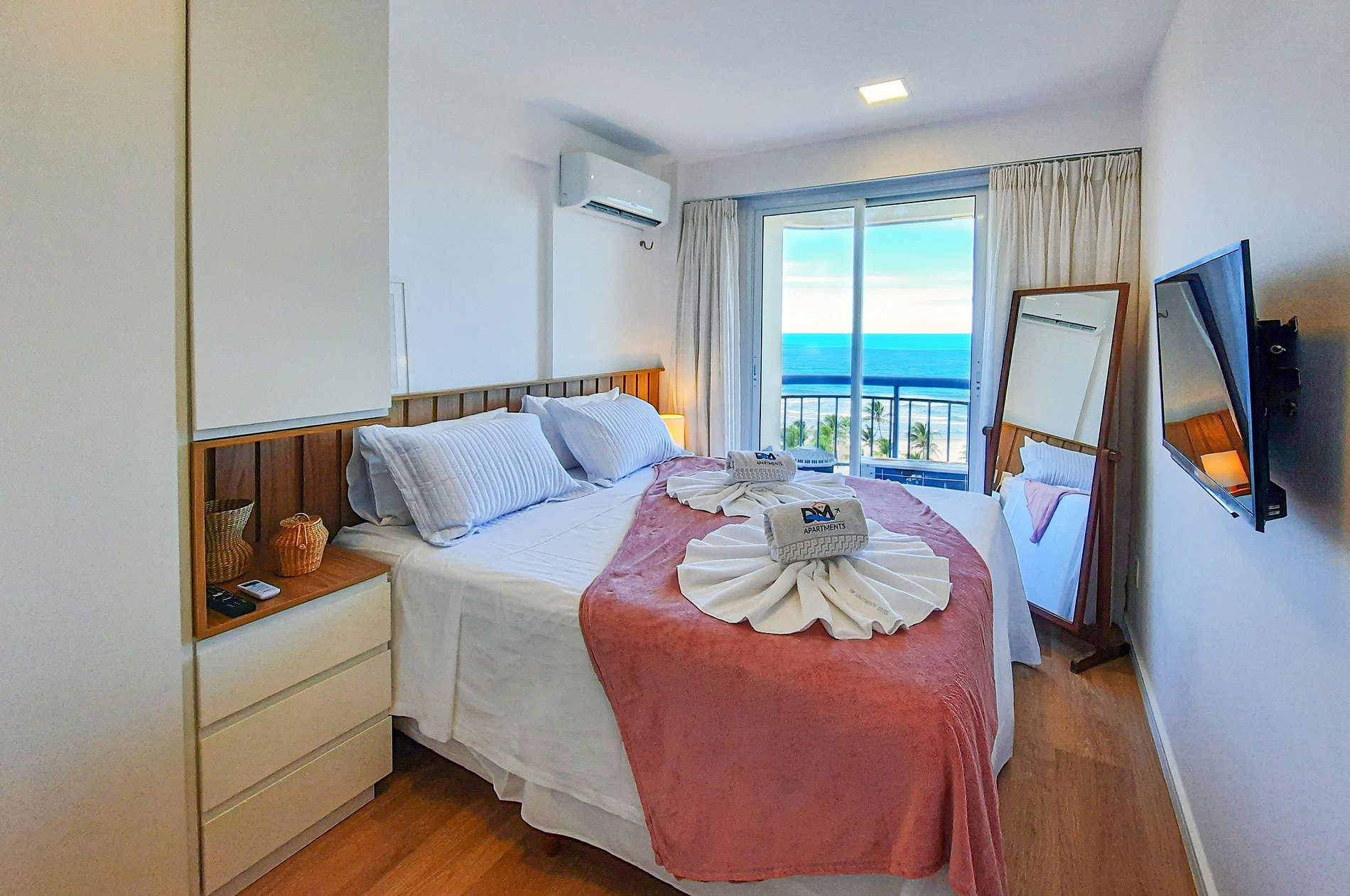 Luxuoso e aconchegante apartamento FRENTE MAR (em frente a Barraca Itaparika), decoração assinada, varanda gourmet com tela de proteção e cortina de vidro com vista incrível, 2 quartos, sendo 1 suíte master, ambos com ar condicionado. Perfeito para descansar após um dia de praia ou na enorme piscina do complexo. Sala com sofá cama casal e TV Smart. A cozinha é completa com geladeira, fogão cooktop 5 bocas, forno, máquina de lavar roupas, micro-ondas, liquidificador, sanduicheira, cafeteira, louças, talheres e panelas, e demais utensílios de cozinha. Tem cortinas blackout, Wi-Fi de qualidade e oferecemos roupas de cama e banho. 1 vaga na garagem.