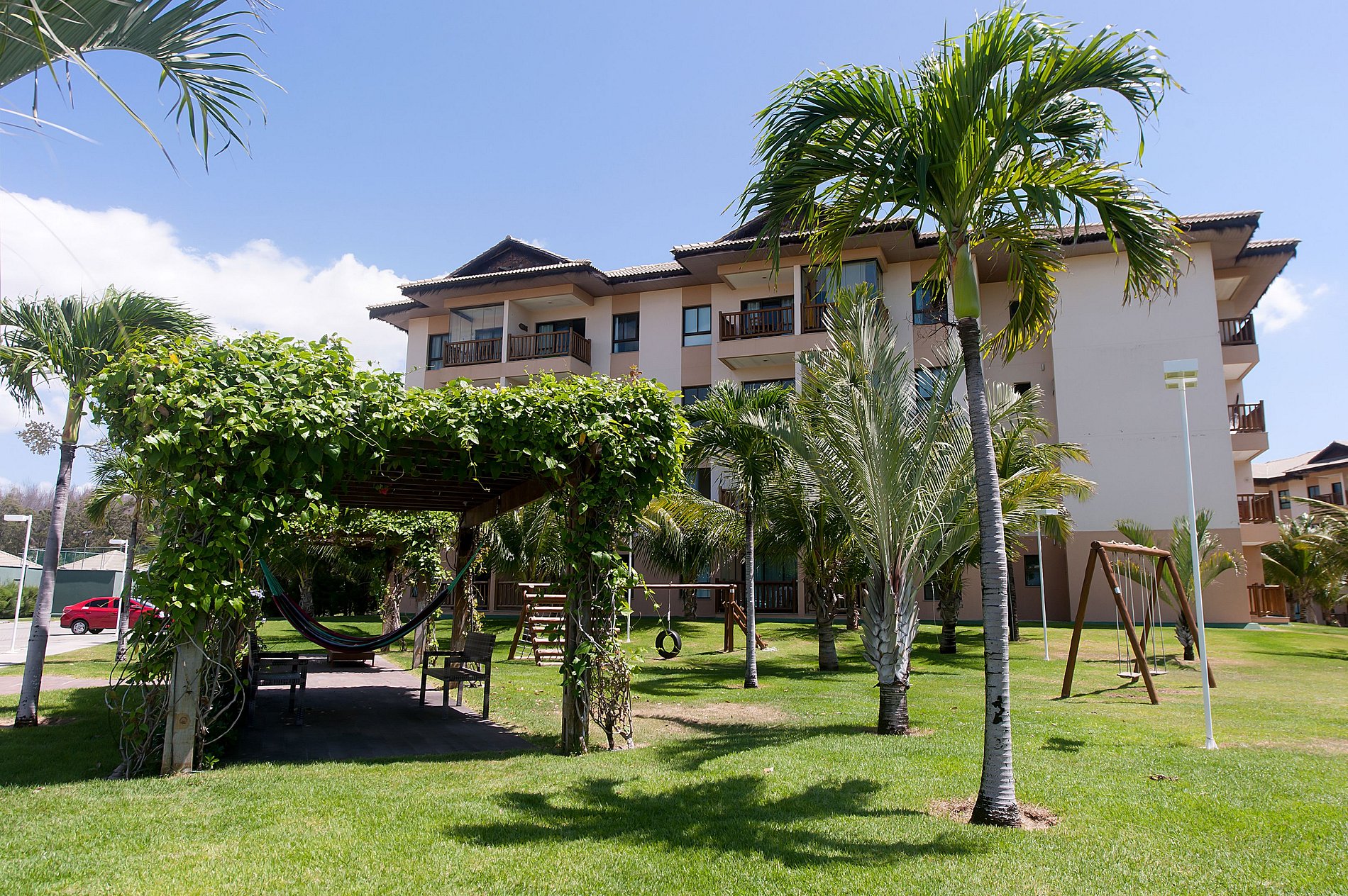 Apartamento térreo de 39m² no VG Sun Cumbuco, com 1 suíte com ar condicionado, e sala com sofá cama e TV, acomoda até 4 pessoas. Oferecemos enxoval de cama e banho completo, WiFi, 1 vaga para veículo disponível. O acesso ao apartamento se dá por fechadura eletrônica, para maior comodidade e segurança do hóspede. O condomínio possui portaria 24h.