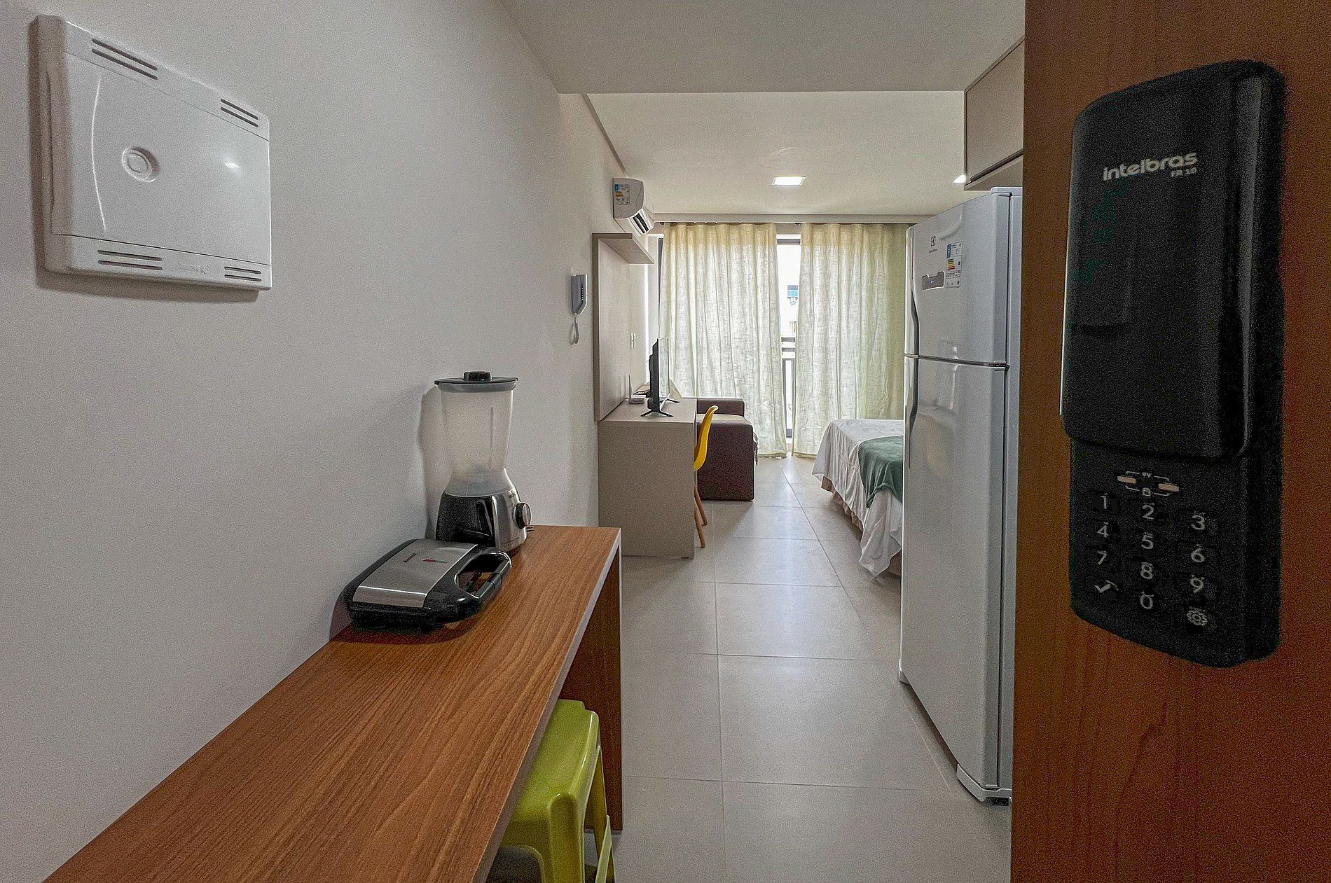 - O acesso é realizado por portaria eletrônica (chave virtual) com monitoramento 24h por câmeras.