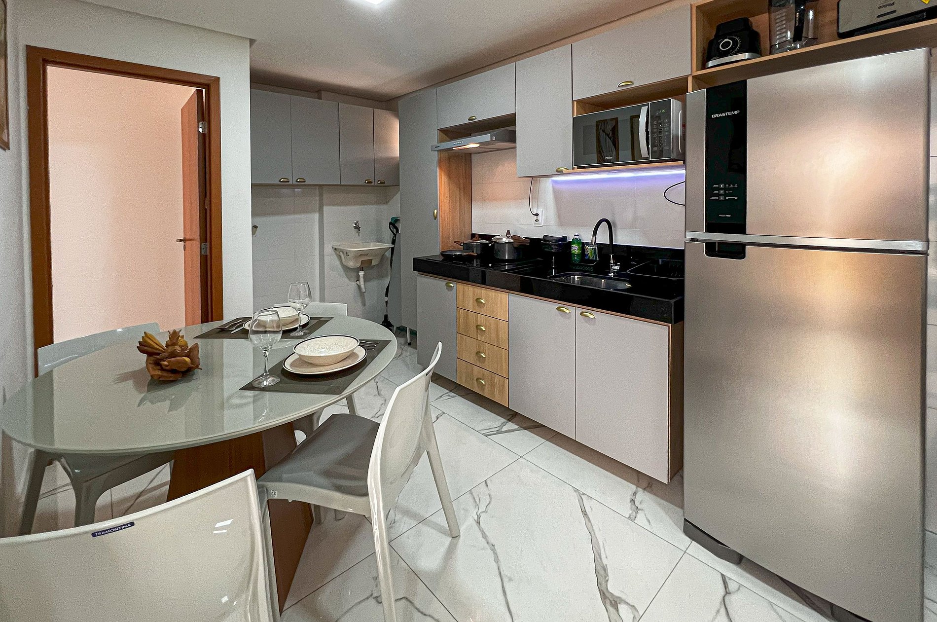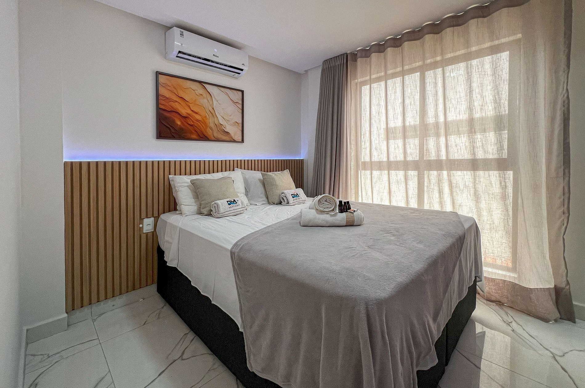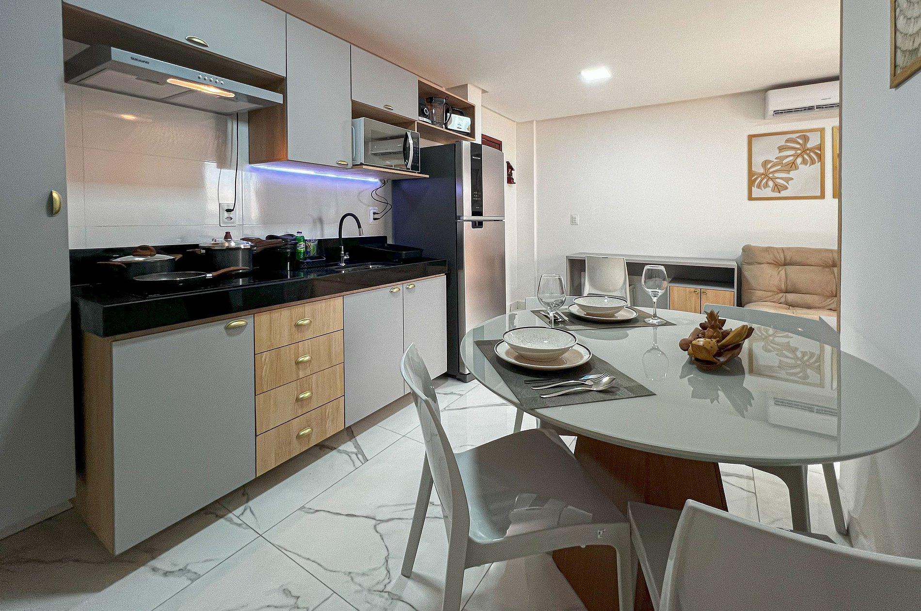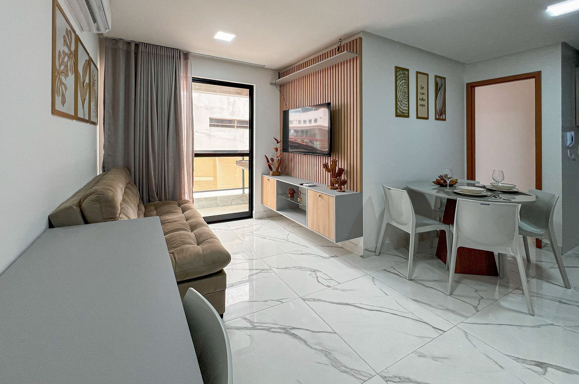 Charmoso apartamento na Praia do Bessa, o VILA ACONCHEGO RESIDENCE é um condomínio Familiar NOVO com apenas 9 unidades (entregue em Set/23), localizado apenas 200m do praia, pertinho de tudo que você precisa para maior comodidade (restaurantes, farmácias, padaria, posto combustível...), decoração moderna, cozinha super bem equipada, 1 suíte master com ar condicionado e TV, um local perfeito para descansar após um dia de praia. Na sala temos um confortável sofá cama, ar condicionado e TV Smart. As cortinas são blackout em todas as janelas, tem Wi-Fi e oferecemos roupas de cama e banho. 1 vaga na garagem para veículos pequenos/SUV médio.