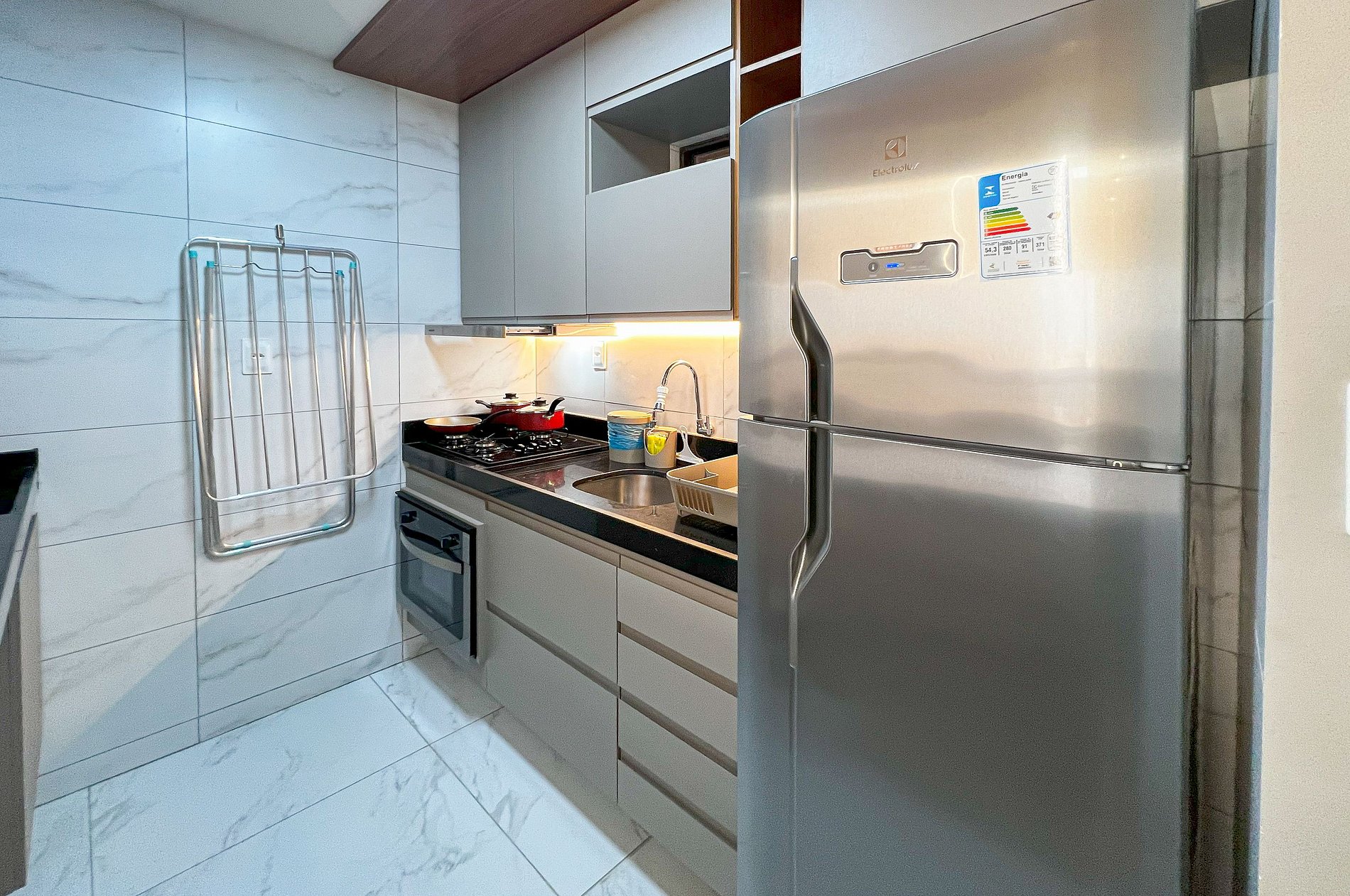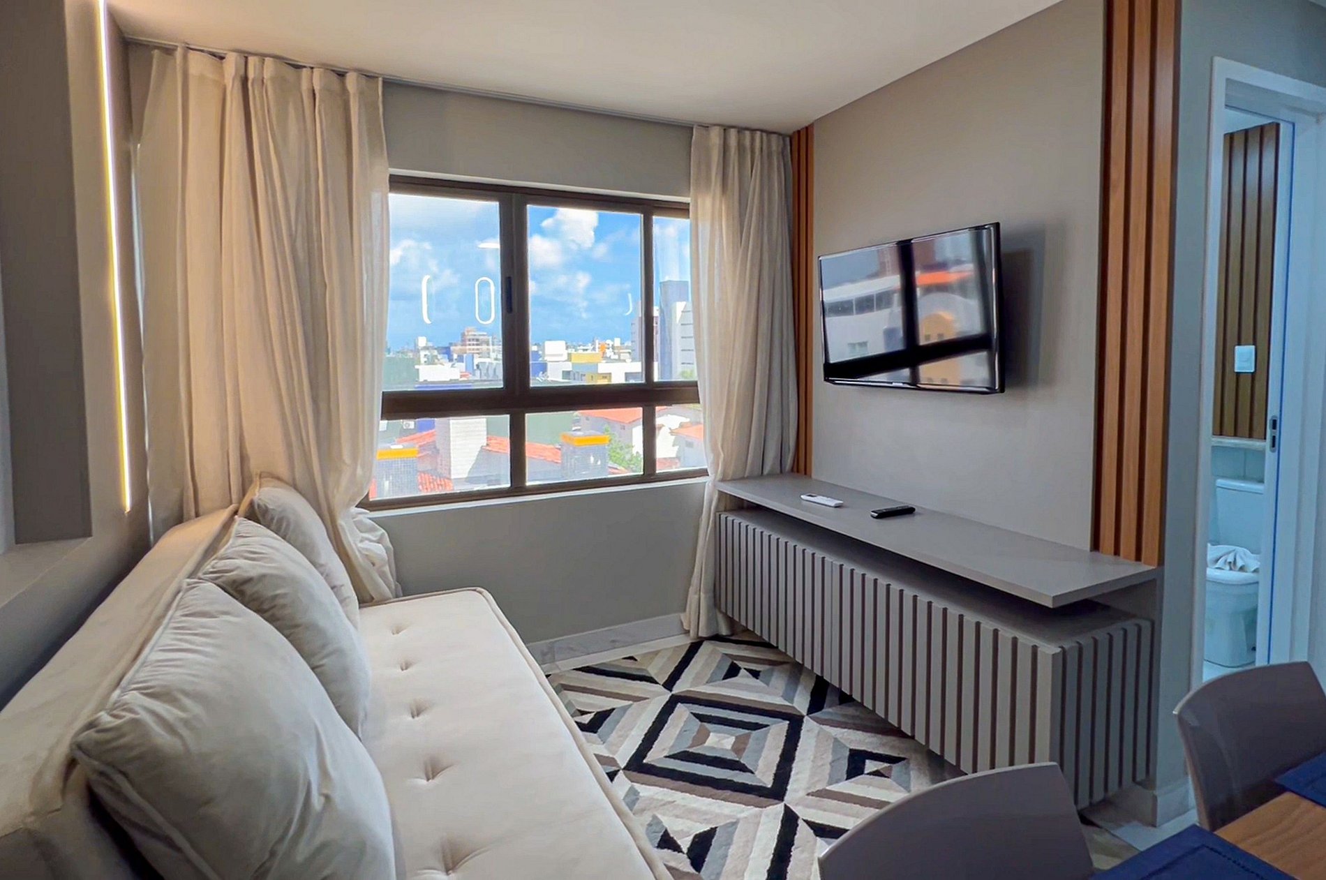 Charmoso Apartamento na Praia do Bessa, O Residencial Hermano Virgolino é condomínio NOVO (entregue em Set/24), localizado apenas 400m do praia, pertinho de tudo que você precisa para maior comodidade (Restaurantes, Farmácias, Padaria, Posto Combustível...), decoração moderna, cozinha super bem equipada, 1 Quarto com ar condicionado e Sala com Sofá Cama Casal + Ar Condicionado + TV, um local perfeito para descansar após um dia de praia. As cortinas são Blackout em todas as janelas, Wi-FI de alta velocidade e oferecemos roupas de cama e banho. 1 vaga na garagem.