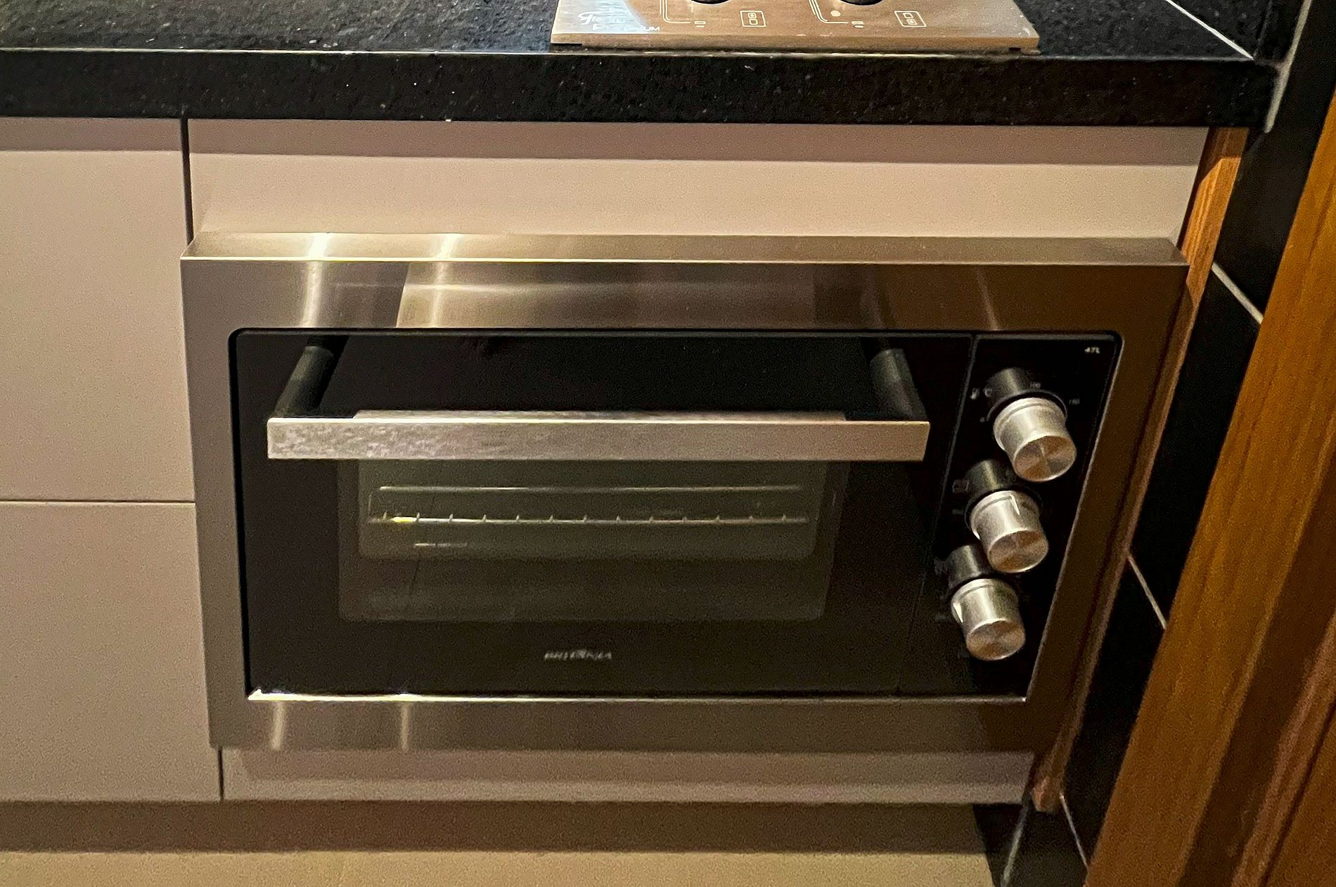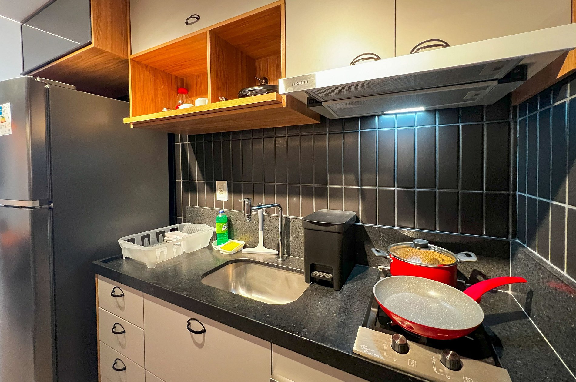 - Cozinha Compacta com Geladeira, Cooktop, Forno Micro Ondas, Sanduícheira, Liquidificador, Panelas