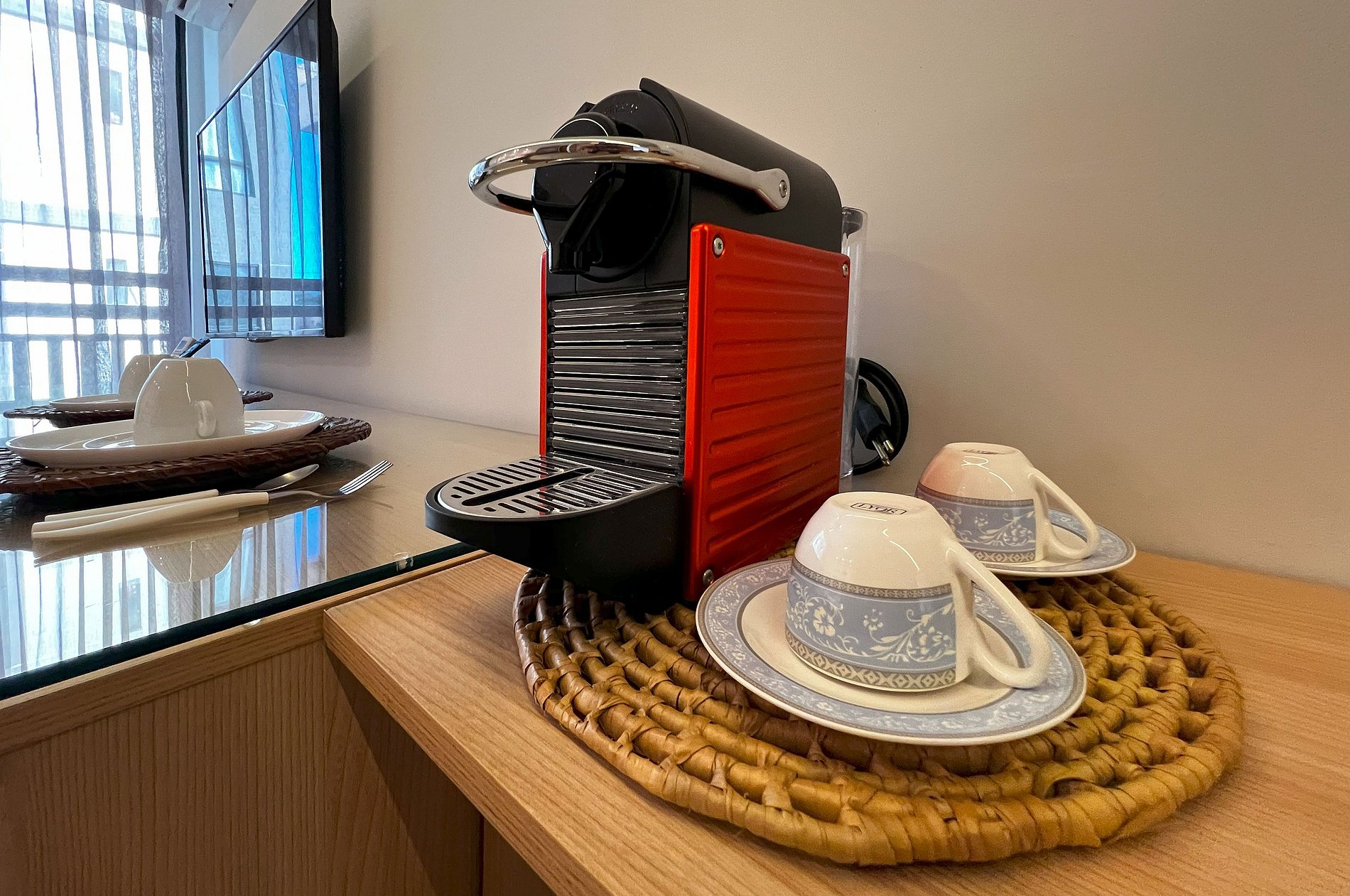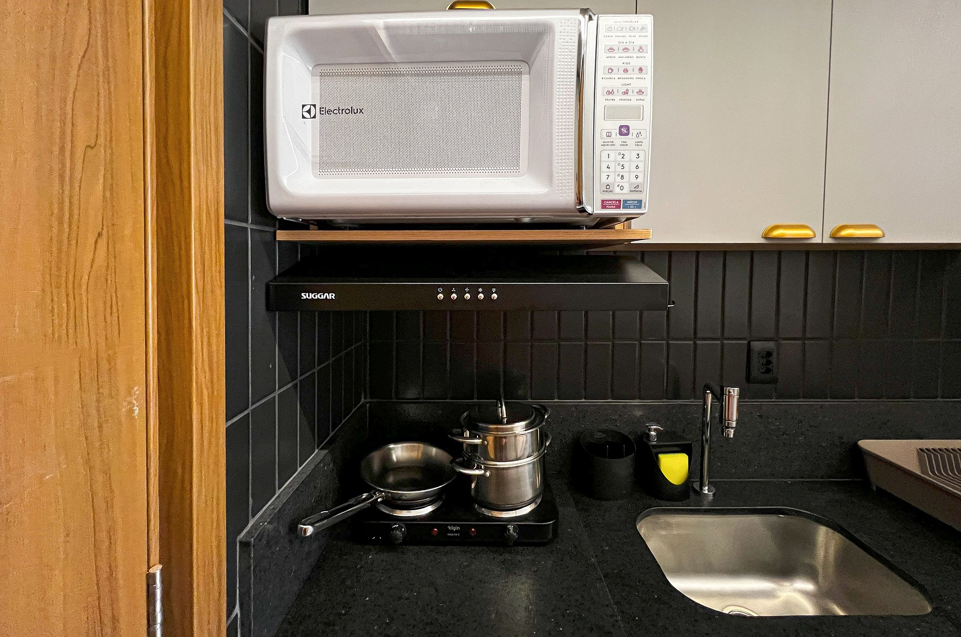 - Cozinha Compacta com Geladeira, Cooktop de Indução, Cafeteira Nespresso, Air Fryer, Torradeira, Sanduícheira, Liquidificador, Panelas