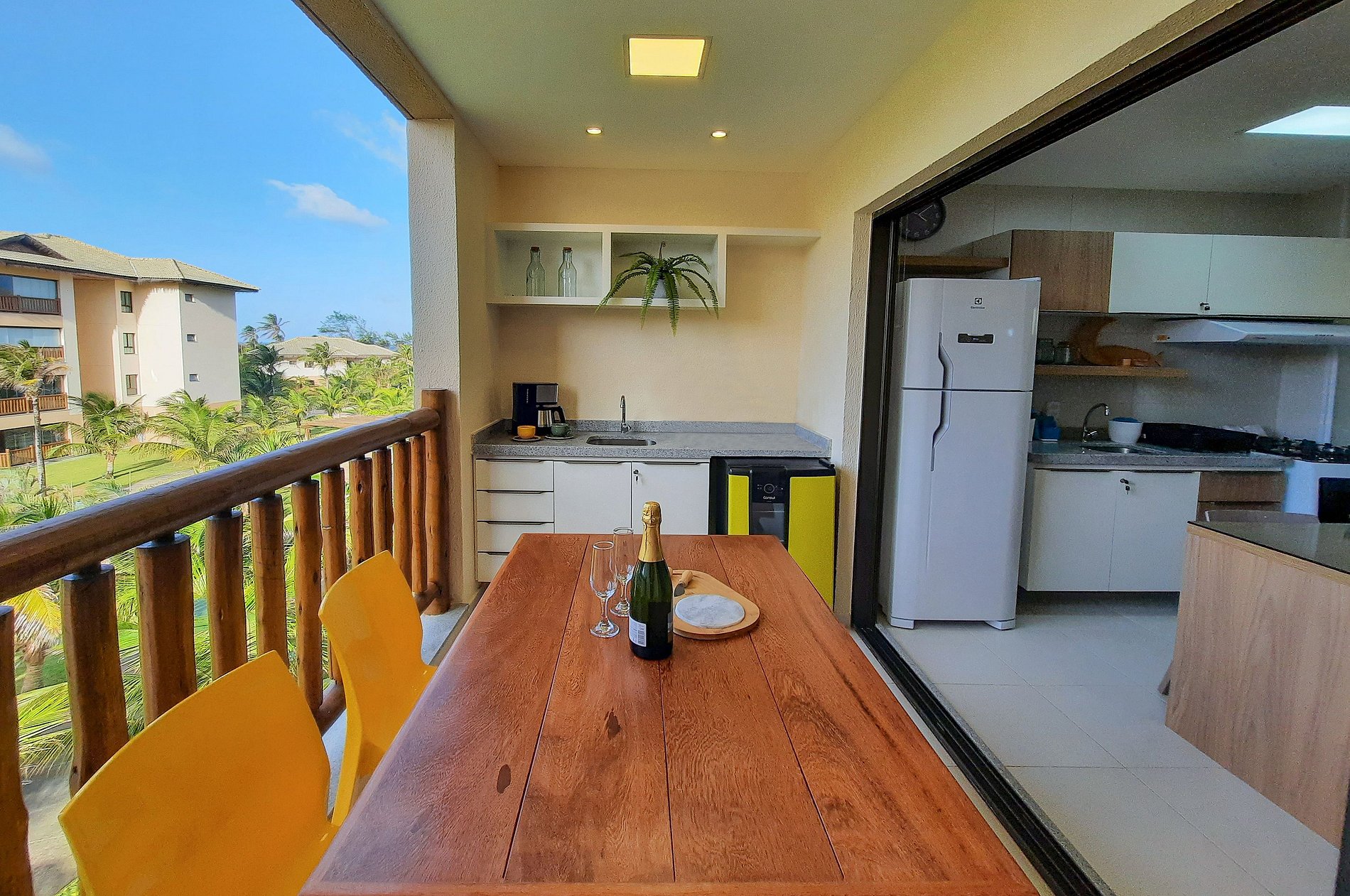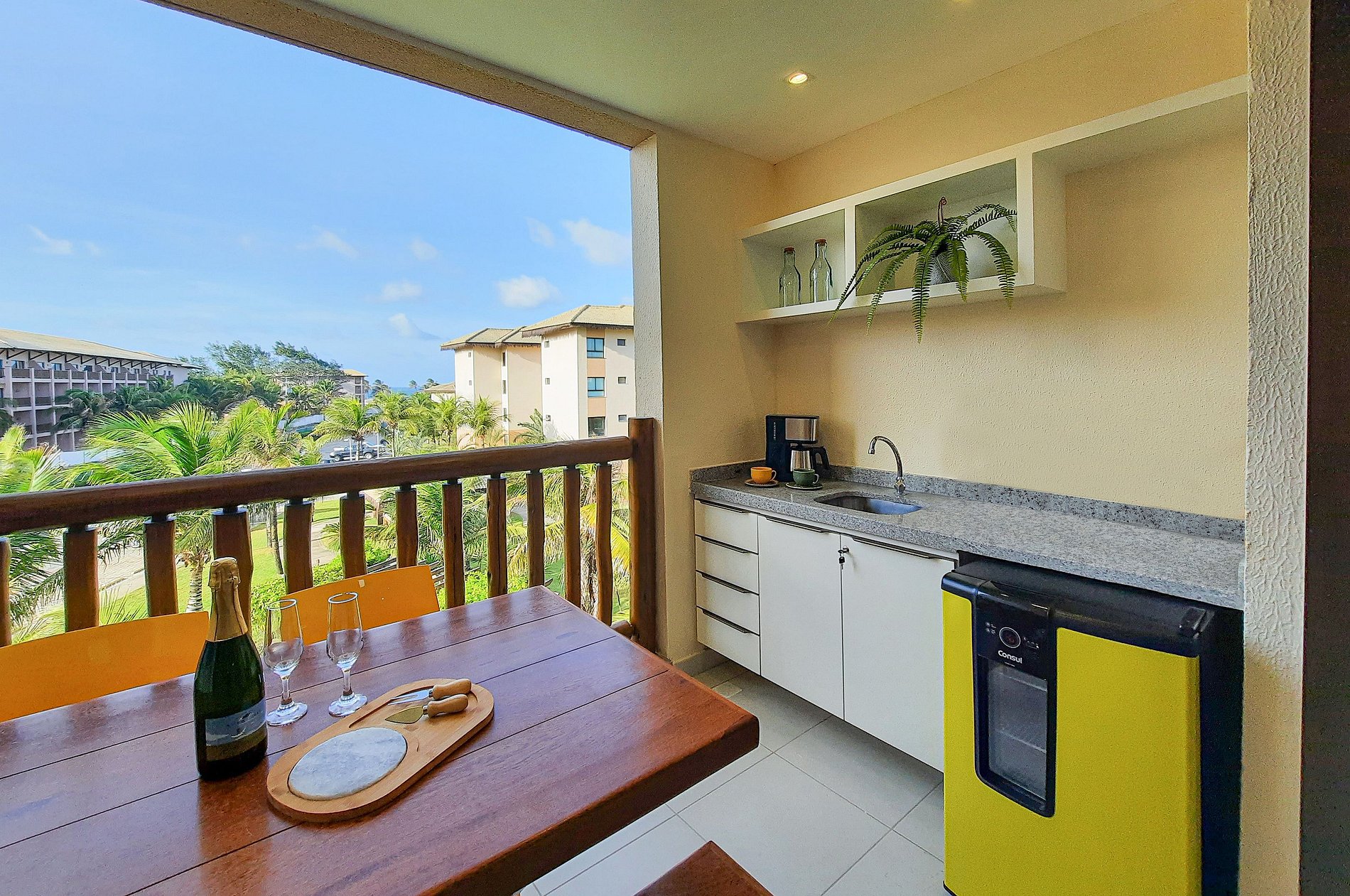 Sofisticado apartamento no VG Sun Cumbuco de 62m², com 2 suítes, localizado no 3º andar (posição norte), ao lado da piscina, super moderno, perfeito para descansar após um dia de praia ou na enorme piscina do complexo. As suítes possuem ar condicionado, cortina blackout e TV Smart (Suíte Master). Sala com sofá para 3 pessoas e TV. A varanda gourmet é um charme à parte, com cervejeira e mesa com 4 lugares. A cozinha é super completa, com máquina lava e seca e Wi-Fi.