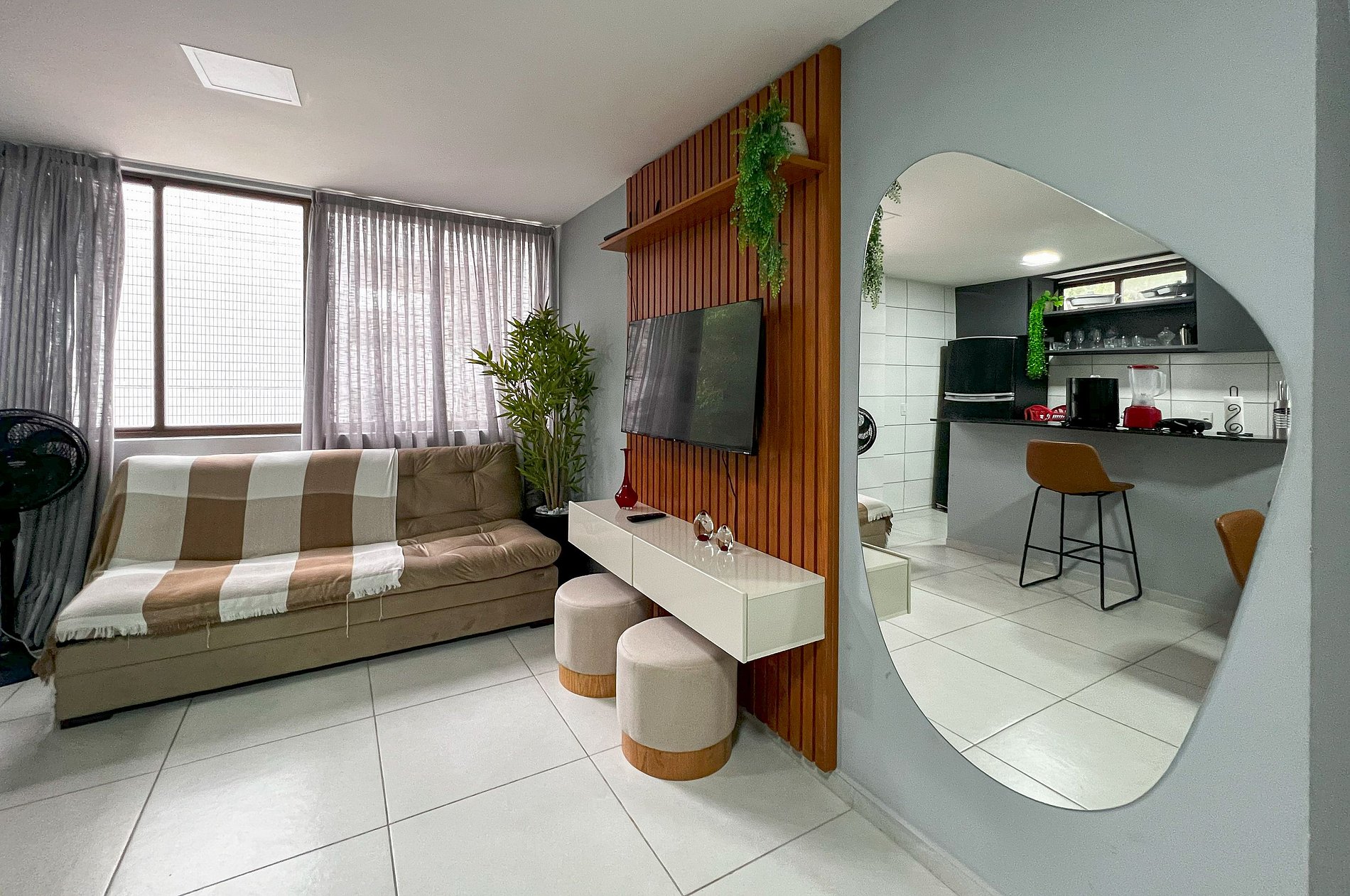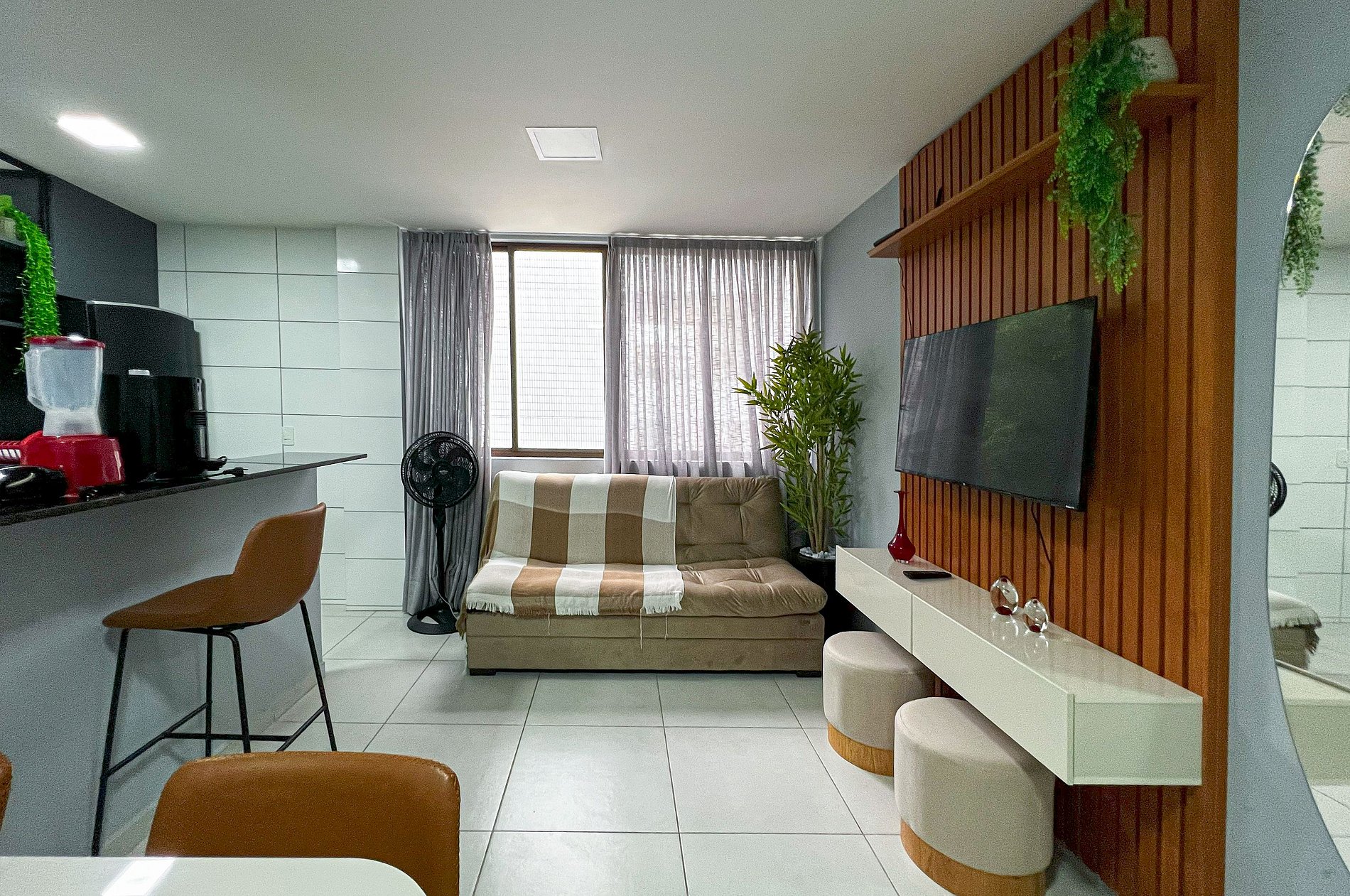Aconchegante apartamento no FLAT LÍRIOS DO CABO BRANCO, apenas 1 quadra da praia do Cabo Branco, a melhor região para se hospedar em João Pessoa. Próximo ao Food Park Cabo Branco e Bar do Cuscuz. O flat é equipado de forma a trazer maior comodidade e conforto para nossos clientes. O apartamento está localizado no 2º andar, com 45m², tem 1 banheiro, 1 quarto com cama casal e 1 cama solteiro, decoração moderna, perfeito para descansar após um dia de praia ou no rooftop do complexo. O quarto ar condicionado, cortina e armários. Sala com sofá, TV e ar Condicionado. A cozinha é bem equipada com eletrodomésticos e utensílios.