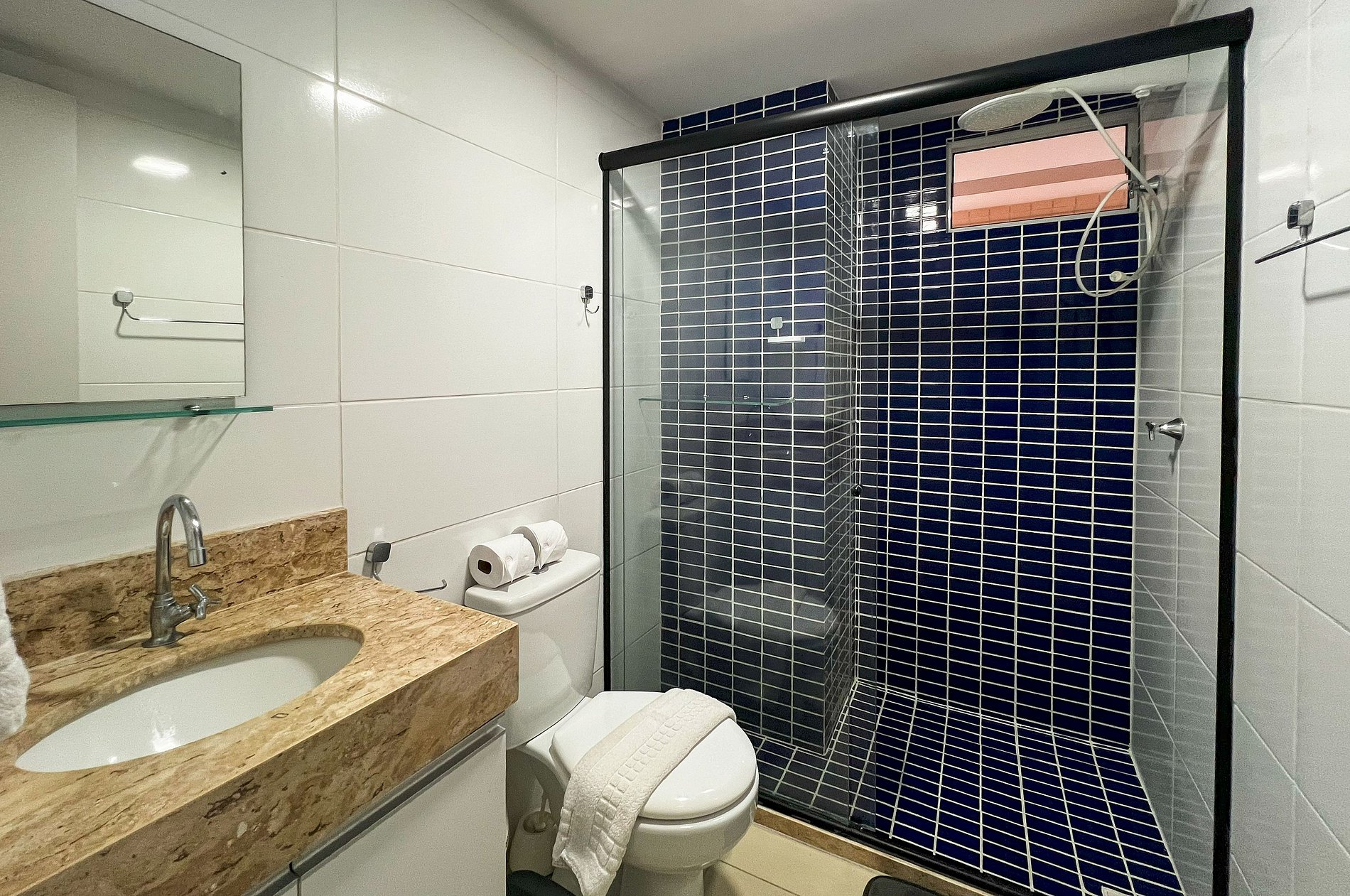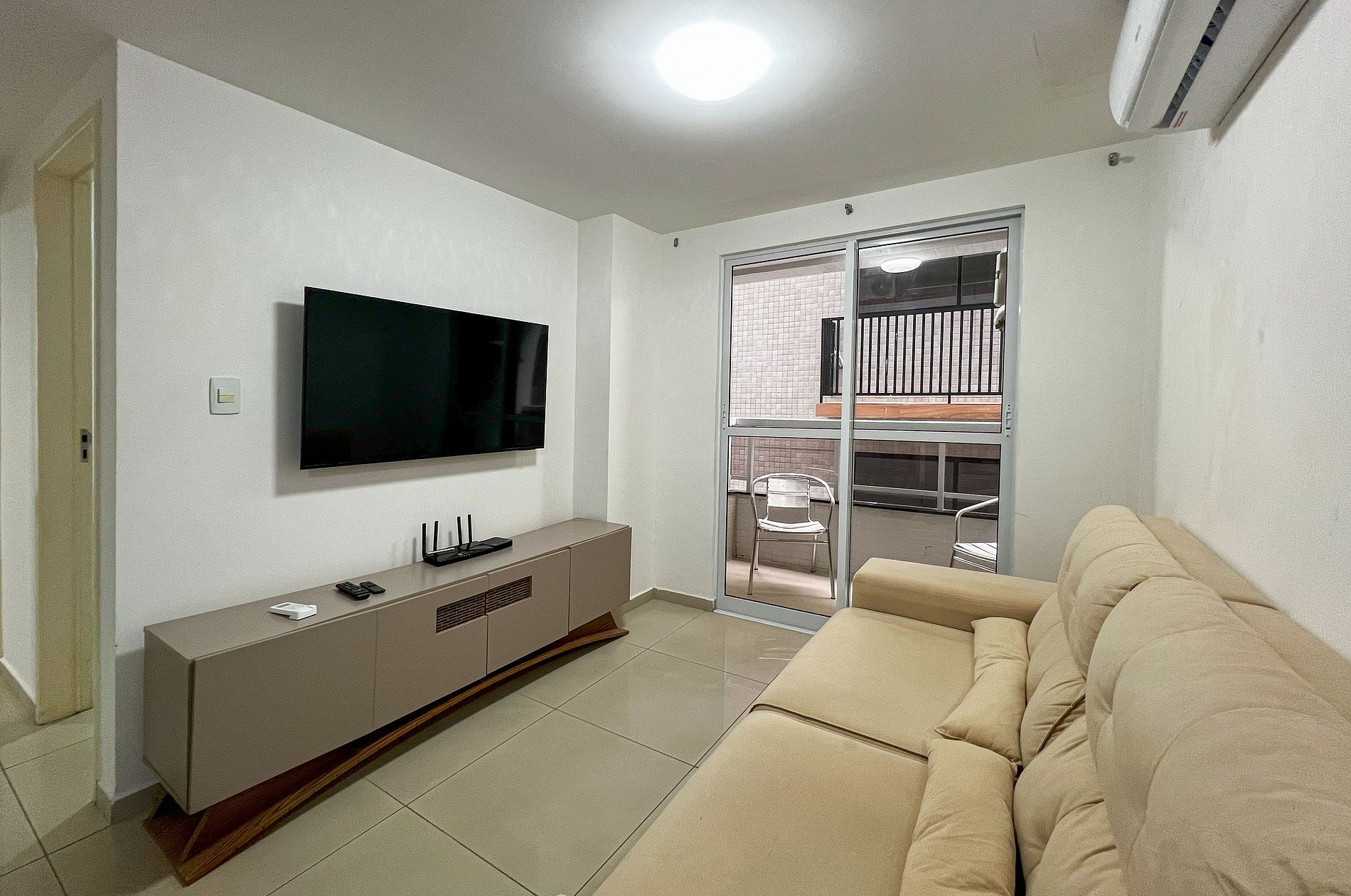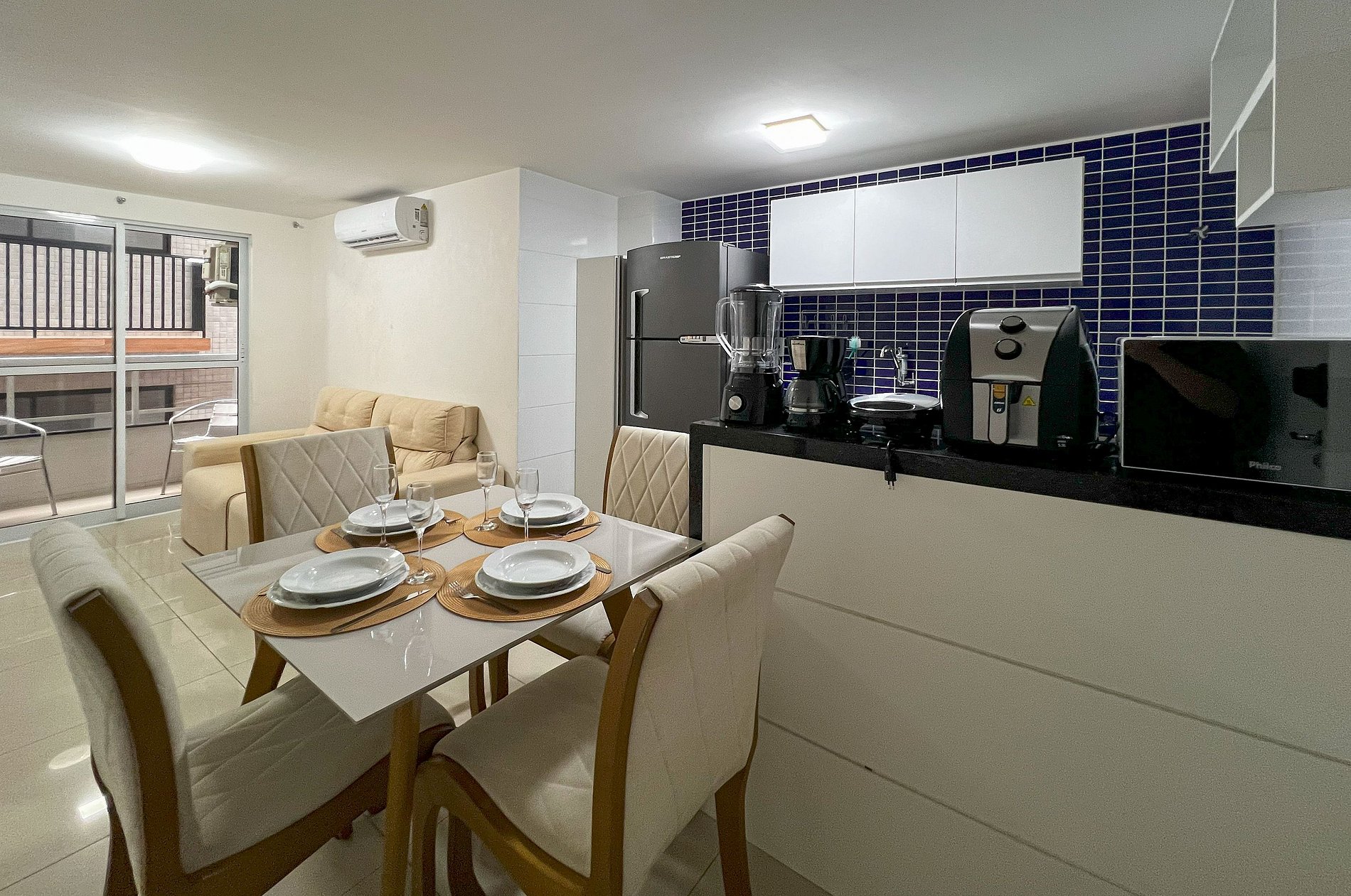 Aconchegante apartamento no ANTÔNIO THEOTÔNIO FLATS CABO BRANCO, apenas 1 quadra da praia do Cabo Branco, a melhor região para se hospedar em João Pessoa. Próximo ao Food Park Cabo Branco e Bar do Cuscuz. O flat é equipado de forma a trazer maior comodidade e conforto para nossos clientes. O apartamento está localizado no 2º andar, com 45m², tem 1 banheiro, 2 quartos com cama casal e 1 colchão extra solteiro, decoração clean, perfeito para descansar após um dia de praia ou no rooftop do complexo. Ambos quartos possuem ar condicionado, cortina e armários. Sala com Sofá, TV e Ar Condicionado. A cozinha é bem equipada com eletrodomésticos e utensílios.