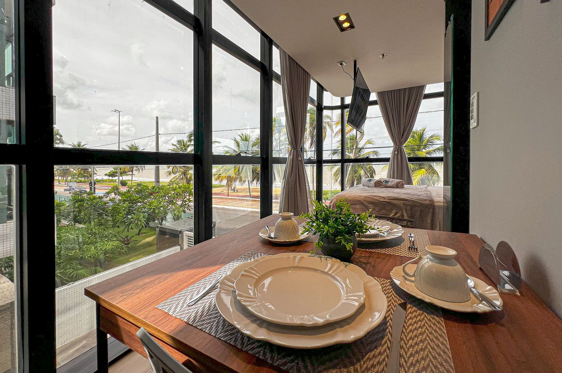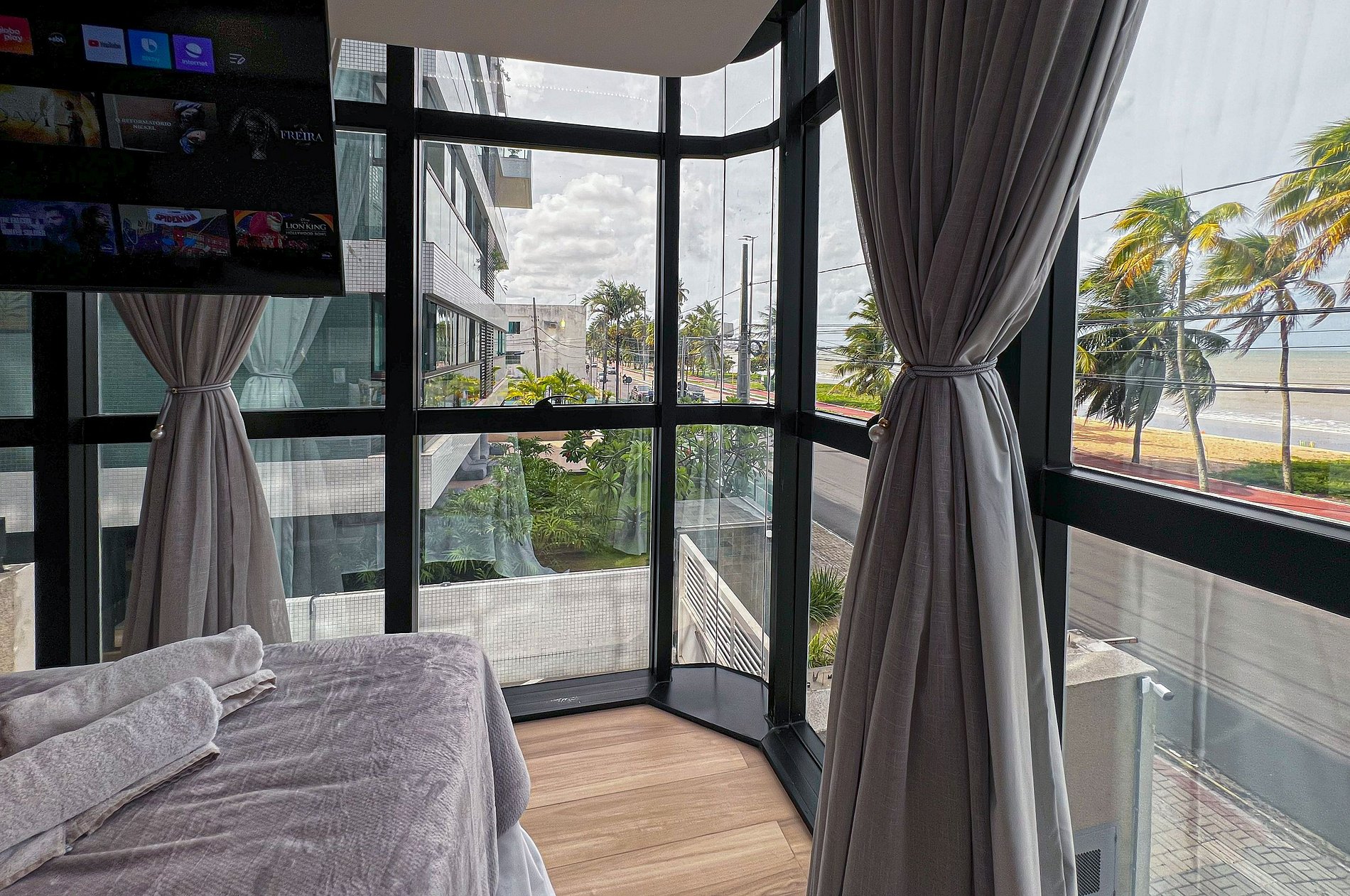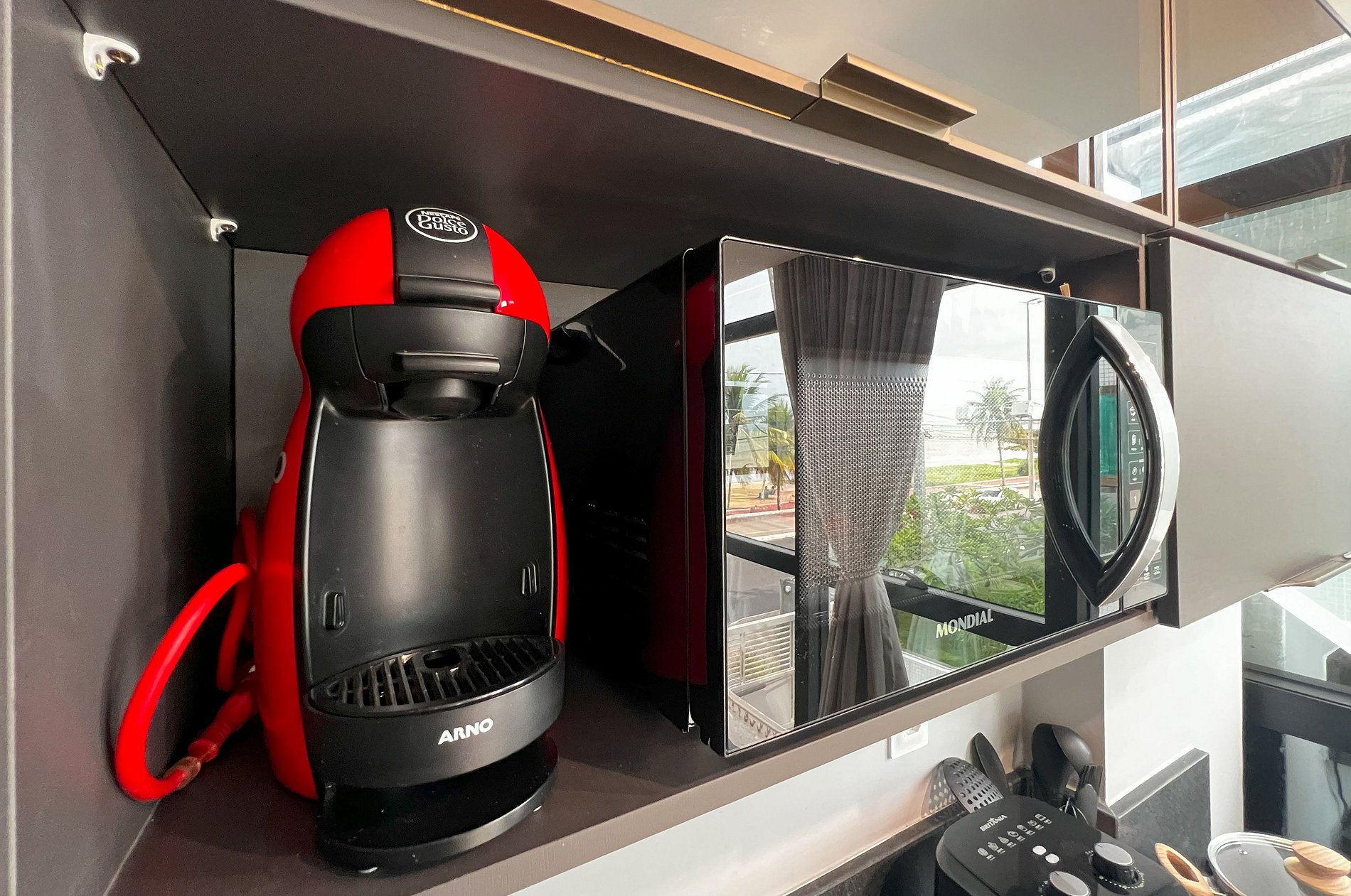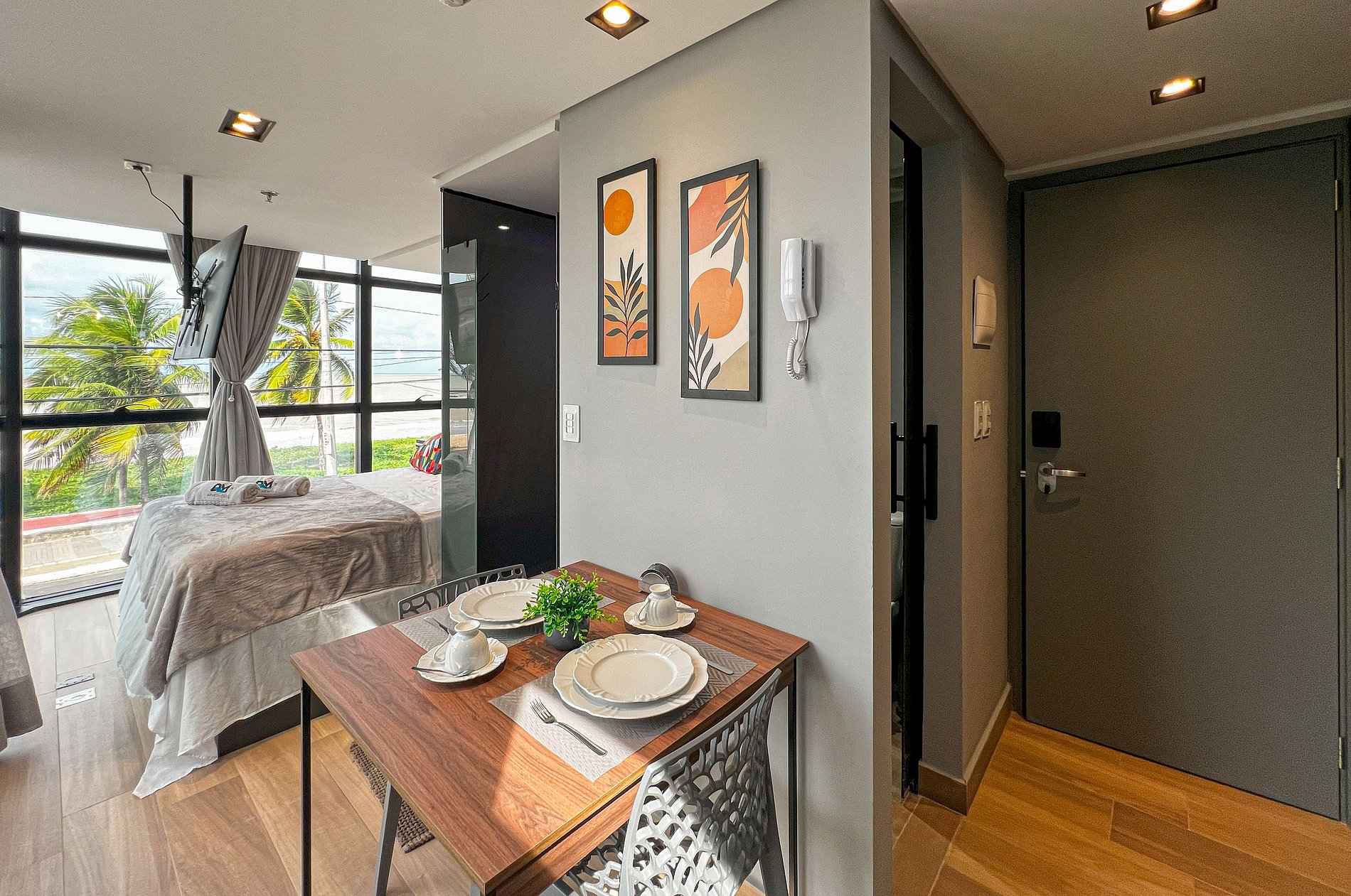 Apartamento no SETAI EDITION CABO BRANCO, localizado na beira mar da praia do Cabo Branco, a melhor região para se hospedar em João Pessoa. Na mesma avenida do Food Park Cabo Branco e Bar do Cuscuz. O flat é equipado de forma a trazer maior comodidade e conforto para nossos clientes. Tem 1 banheiro, decoração moderna, perfeito para descansar após um dia de praia ou no rooftop do complexo. A suíte possui ar condicionado, TV e uma vista mar incrível. A cozinha é equipada com um frigobar, microondas, cooktop (1 boca), airfryer, máquina de café (Dolce Gusto), sanduicheira elétrica e utensílios básicos de cozinha.