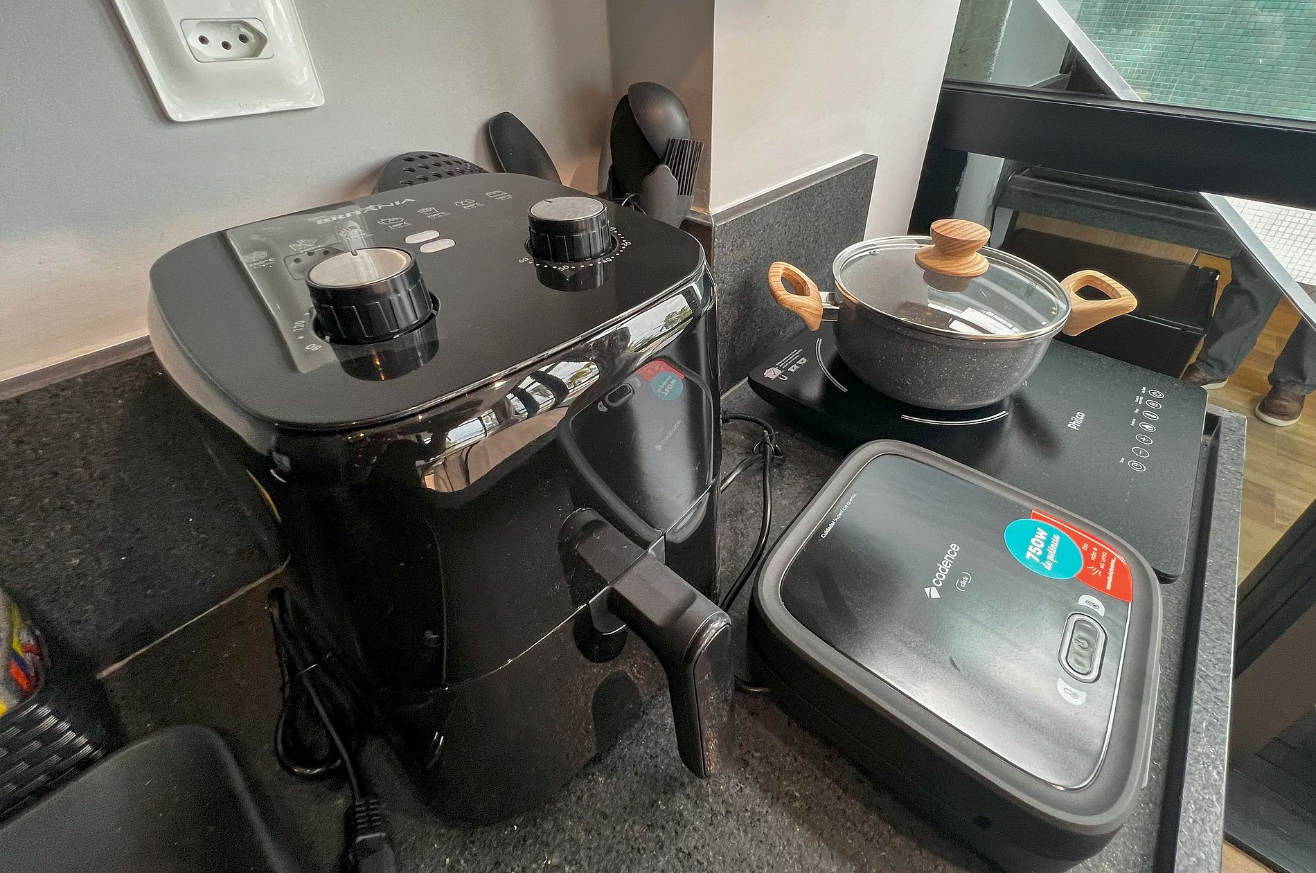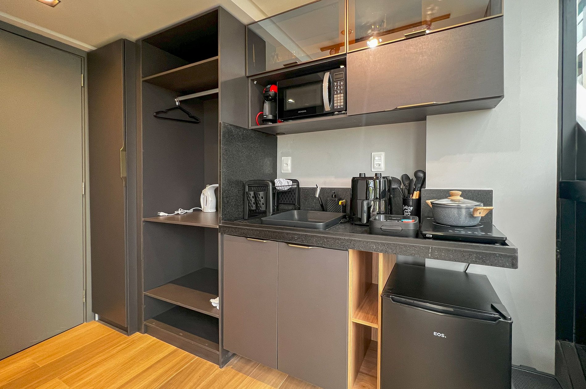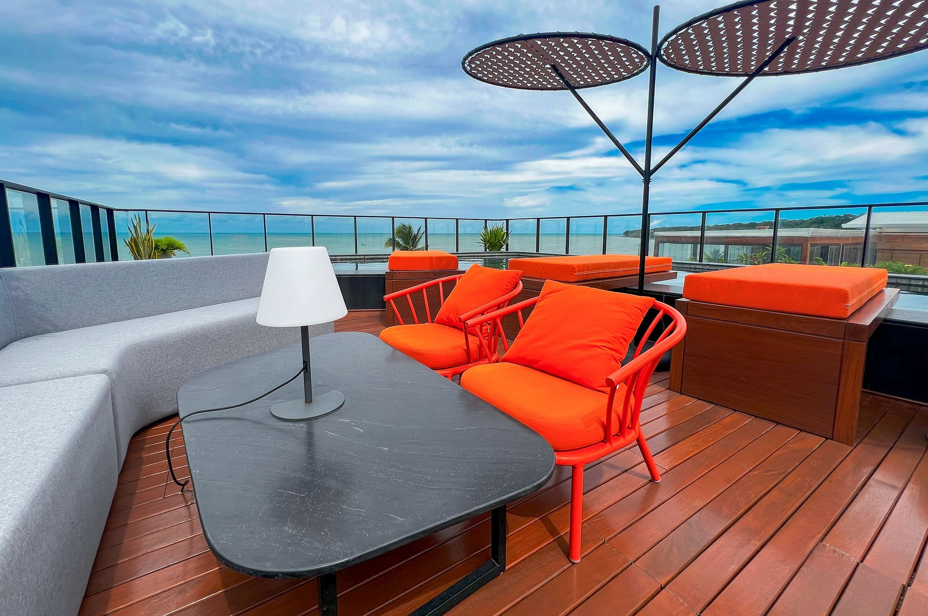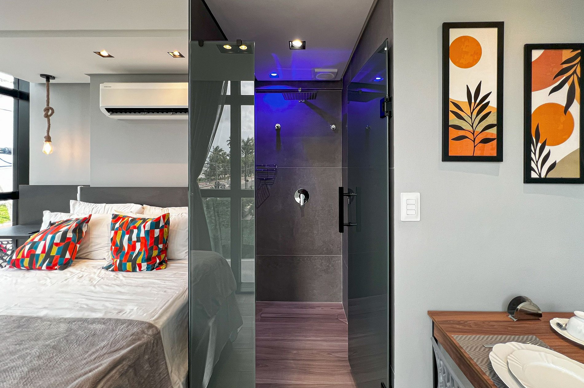 Apartamento no SETAI EDITION CABO BRANCO, localizado na beira mar da praia do Cabo Branco, a melhor região para se hospedar em João Pessoa. Na mesma avenida do Food Park Cabo Branco e Bar do Cuscuz. O flat é equipado de forma a trazer maior comodidade e conforto para nossos clientes. Tem 1 banheiro, decoração moderna, perfeito para descansar após um dia de praia ou no rooftop do complexo. A suíte possui ar condicionado, TV e uma vista mar incrível. A cozinha é equipada com um frigobar, microondas, cooktop (1 boca), airfryer, máquina de café (Dolce Gusto), sanduicheira elétrica e utensílios básicos de cozinha.