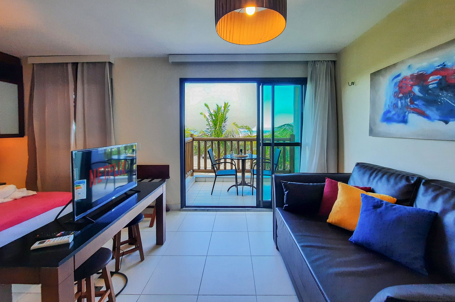 Apartamento confortável é bem equipado.Condominio de alto padrão com piscinas grandes e bela vista do mar.