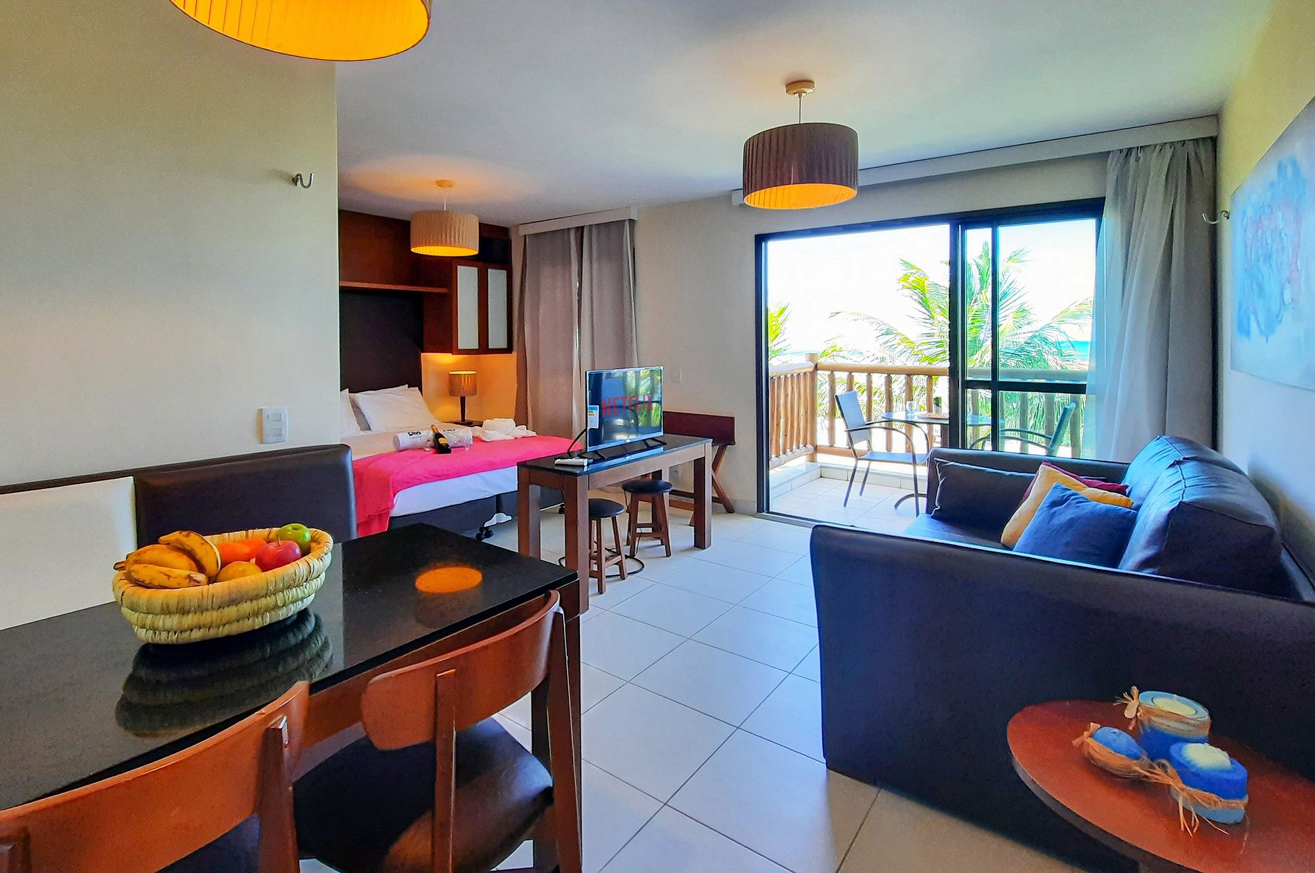 Apartamento studio no VG Sun Cumbuco, localizado no 1º andar, posição nascente vista mar, com 1 suíte com ar condicionado (sem divisão com a sala), e sala com sofá cama e TV, acomoda até 4 pessoas. Oferecemos enxoval de cama e banho completo, WiFi, 1 vaga para veículo disponível. O acesso ao apartamento é por fechadura eletrônica, para maior comodidade e segurança do hóspede. O condomínio possui portaria 24h. Cozinha bem equipada com micro-ondas, fogão, geladeira e utensílios de cozinha.