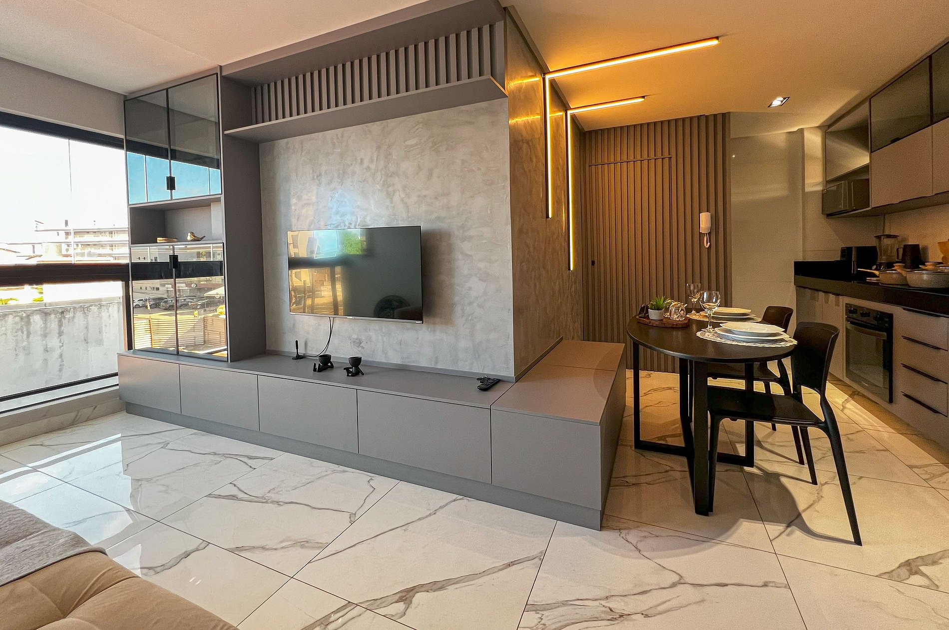 Charmoso apartamento duplex de 1 suíte, muito bem equipado, com TV Smart na sala, roupas, cozinha com cooktop, forno, air fryer, geladeira grande, filtro de água e Utensílios Domésticos para você se sentir em casa. 1 vaga na garagem (cabe veículo pequeno/SUV médio). O prédio fica pertinho de restaurantes, farmácias, padaria, posto de combustível, e etc.