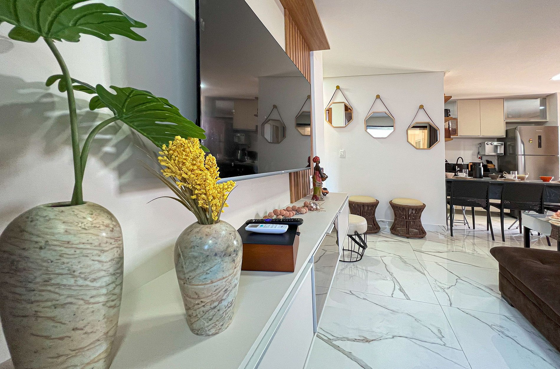 Charmoso apartamento na Praia do Bessa, o VILA ACONCHEGO RESIDENCE é um condomínio Familiar NOVO com apenas 9 unidades (entregue em Set/23), localizado apenas 200m do praia, pertinho de tudo que você precisa para maior comodidade (restaurantes, farmácias, padaria, posto combustível...), decoração moderna, cozinha super bem equipada, 2 quartos, sendo 1 suíte, ambos com ar condicionado, um local perfeito para descansar após um dia de praia. Na sala temos um confortável sofá cama, ar condicionado e TV Smart. As cortinas são blackout em todas as janelas, temos WiFi e oferecemos roupas de cama e banho. 1 vaga na garagem (cabe veículos pequenos/SUV médio).
