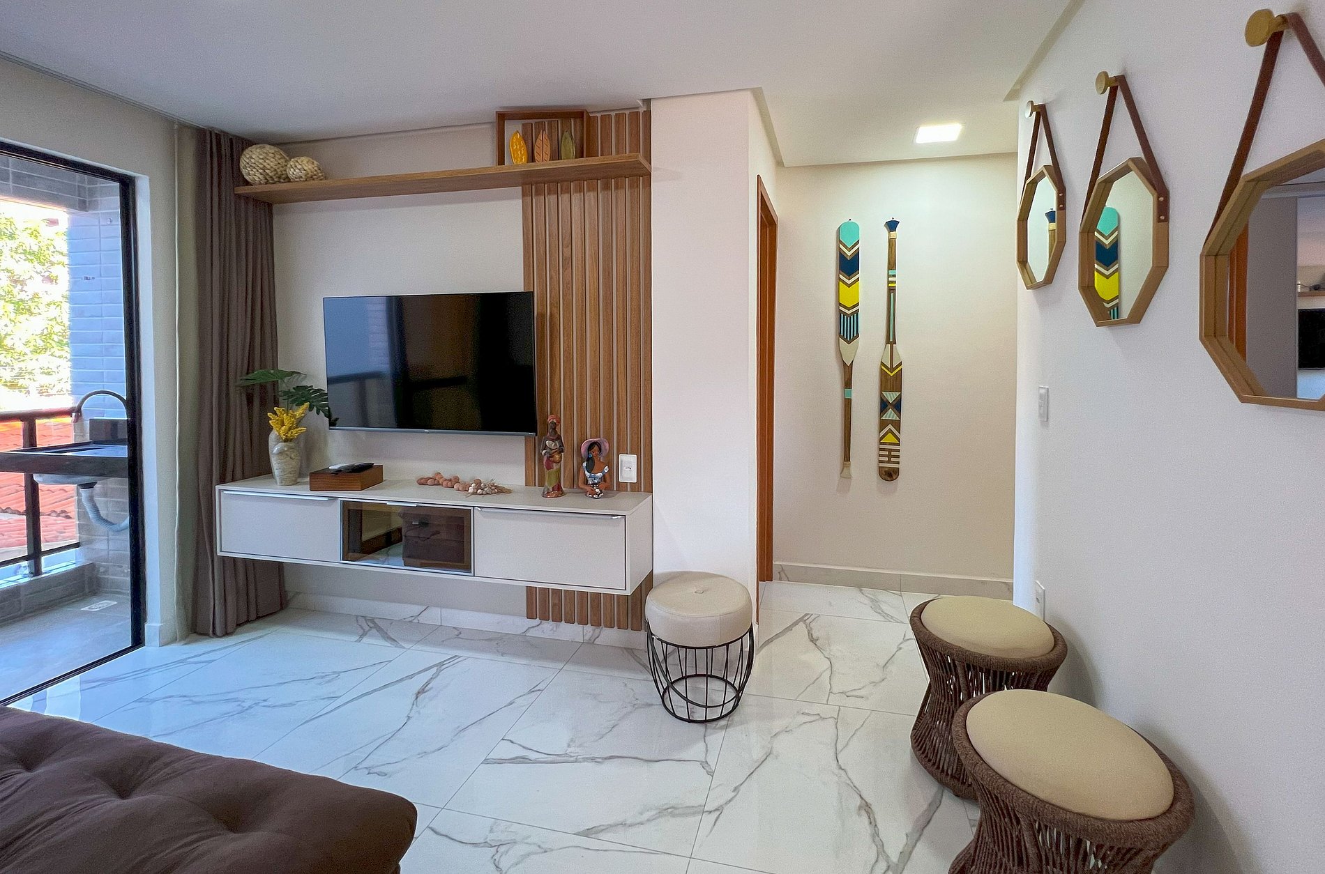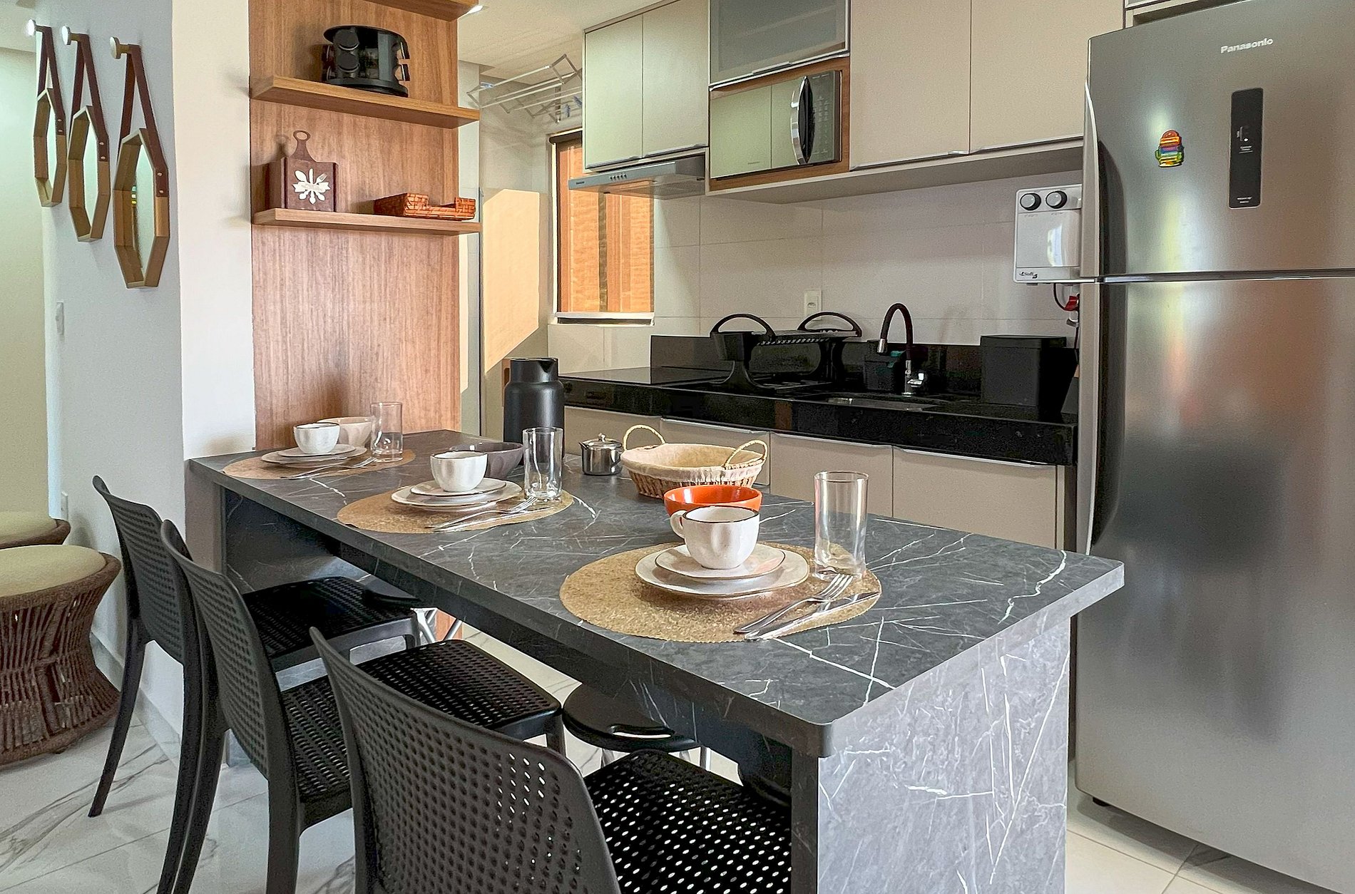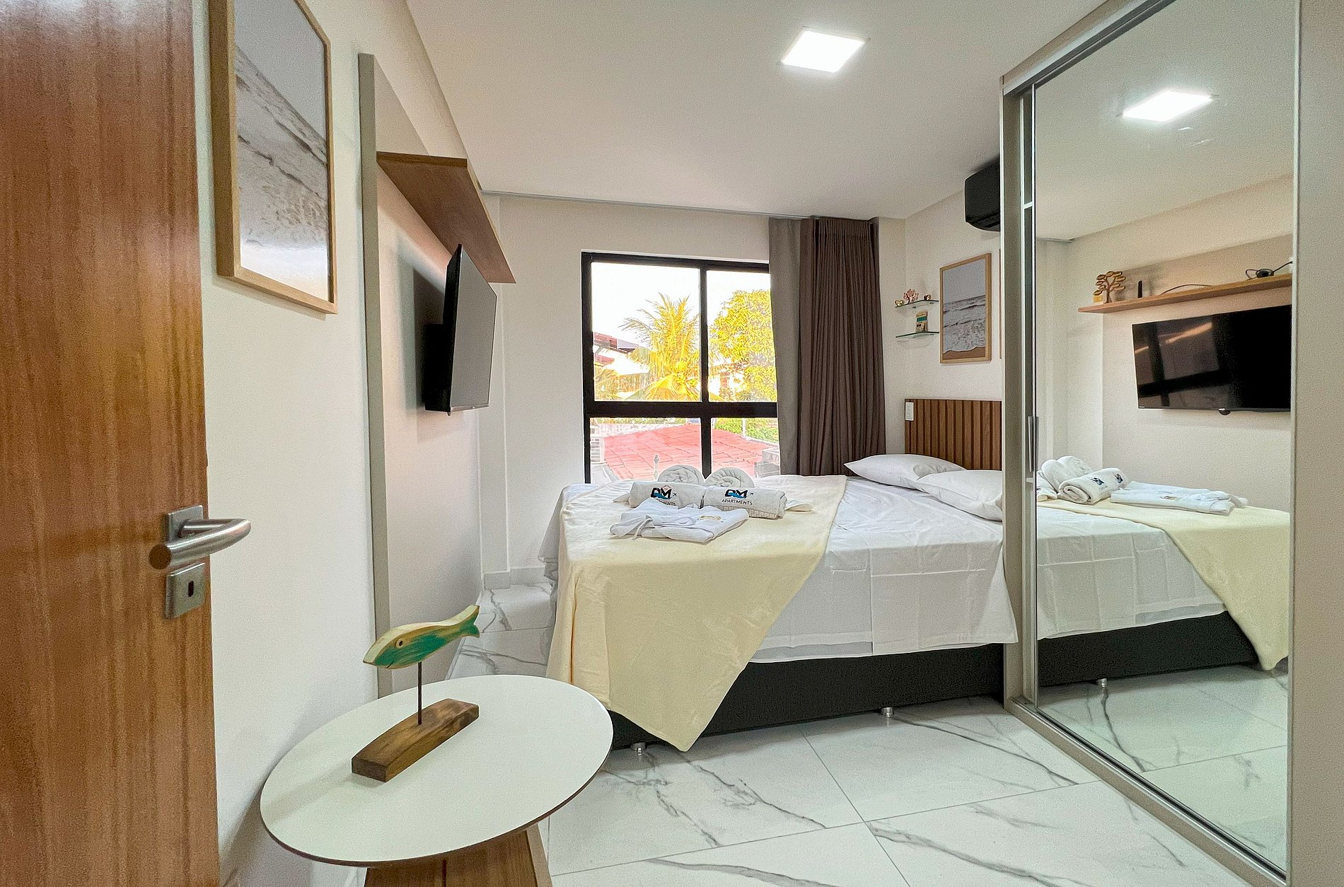 Charmoso apartamento na Praia do Bessa, o VILA ACONCHEGO RESIDENCE é um condomínio Familiar NOVO com apenas 9 unidades (entregue em Set/23), localizado apenas 200m do praia, pertinho de tudo que você precisa para maior comodidade (restaurantes, farmácias, padaria, posto combustível...), decoração moderna, cozinha super bem equipada, 2 quartos, sendo 1 suíte, ambos com ar condicionado, um local perfeito para descansar após um dia de praia. Na sala temos um confortável sofá cama, ar condicionado e TV Smart. As cortinas são blackout em todas as janelas, temos WiFi e oferecemos roupas de cama e banho. 1 vaga na garagem (cabe veículos pequenos/SUV médio).